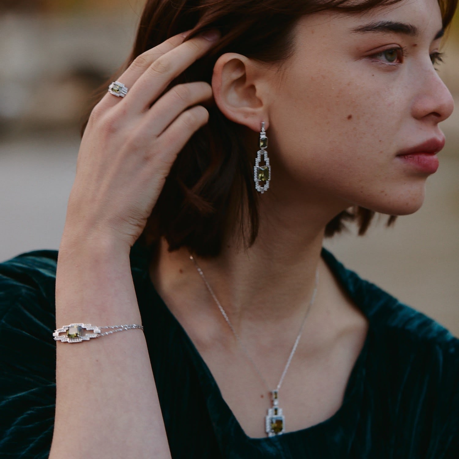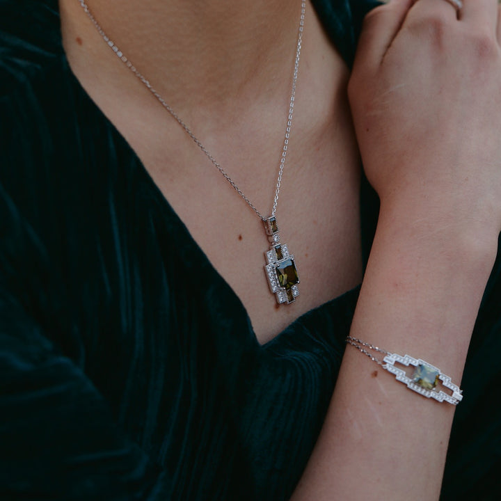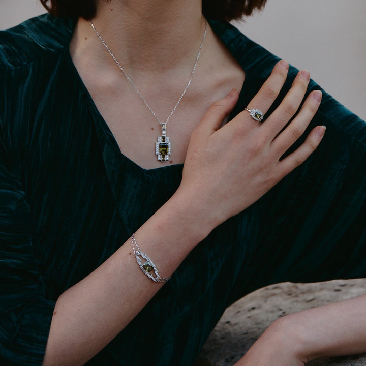 The Hope Corner Bracelet by Retro Chic, from the Art Deco Collection, is an elegant piece featuring a 5A-grade olive-green zircon. The design has a bold contour and refined lines, with a minimalist aesthetic that makes it easy to style for everyday wear. Crafted using 32 meticulous steps by traditional artisans, this bracelet blends classic retro elements with modern aesthetics.