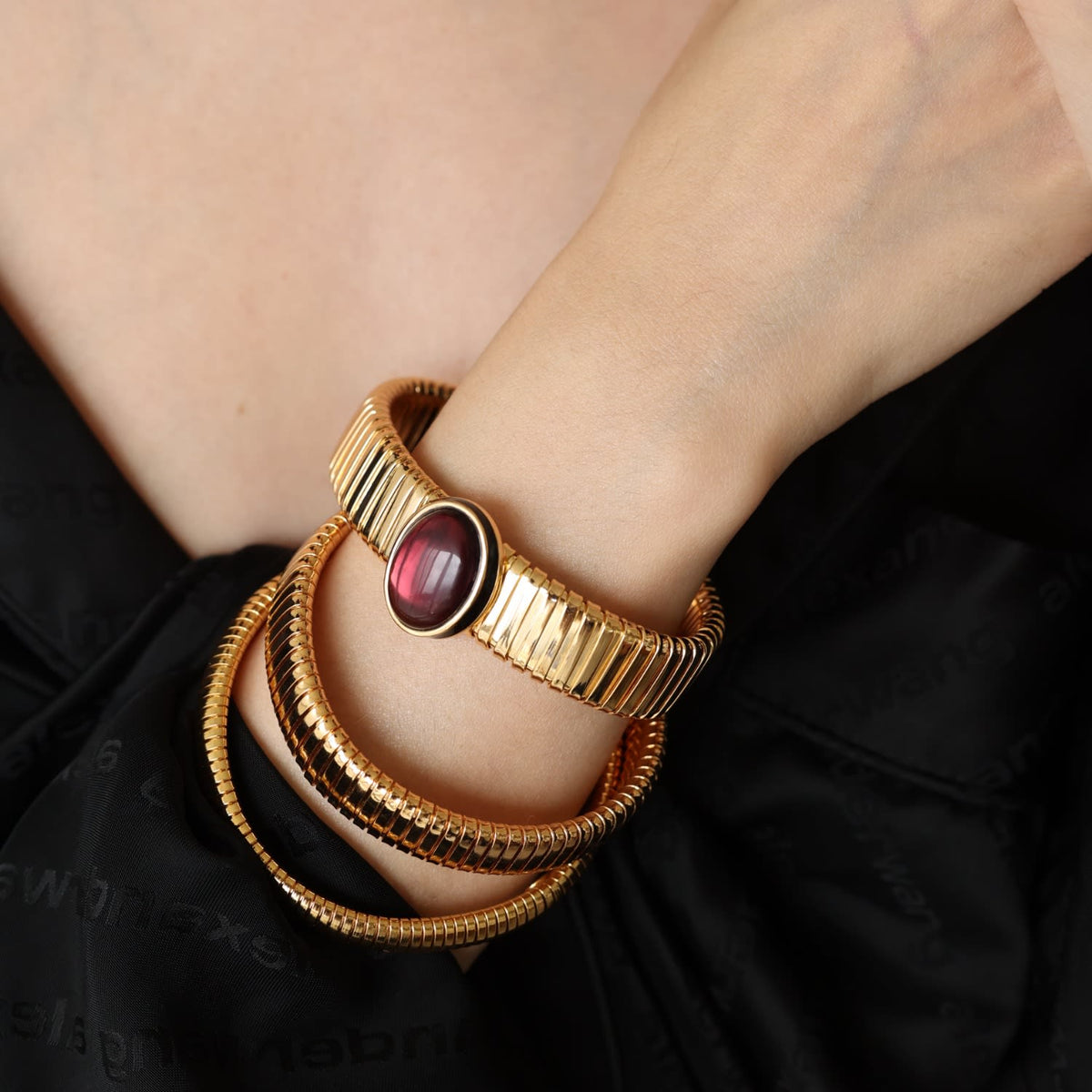 This bangle bracelet is made from gold-plated brass and features black enamel and burgundy glass stones. It is crafted using the Tubogas technique.