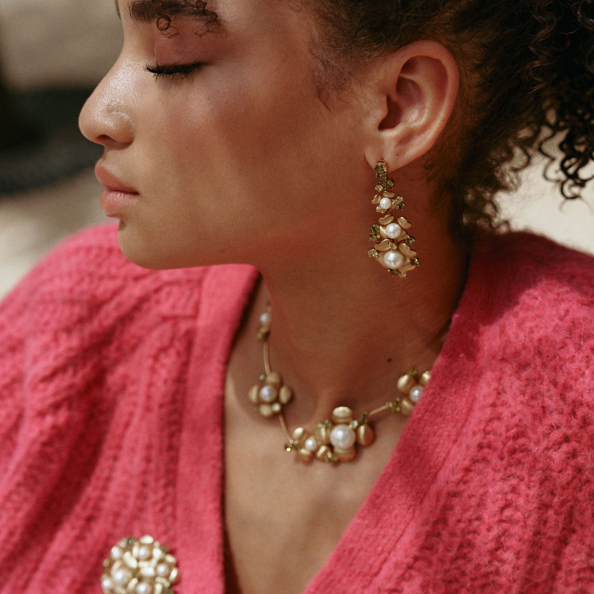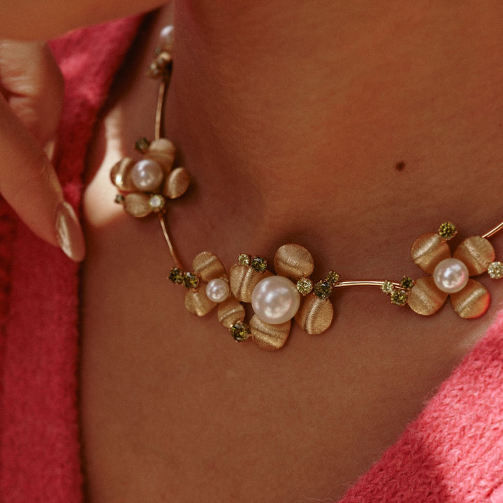 This handcrafted necklace is made from a metal alloy with vintage gold plating. It features nine flowers with hand-engraved textures, hand-set shell pearls, and olive-green zirconia. It takes a month to create due to the 32 meticulous steps.