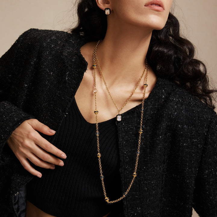 The Roman White Sautoir by Retro Chic is a long necklace inspired by Roman architecture. It features seven hand-cut white gemstones and seven textured metal spheres, creating a layered effect. The design is enhanced with hand-set gems and intricate black enamel work. With its 109cm length, it offers multiple styling options and is a testament to artisanal craftsmanship.
