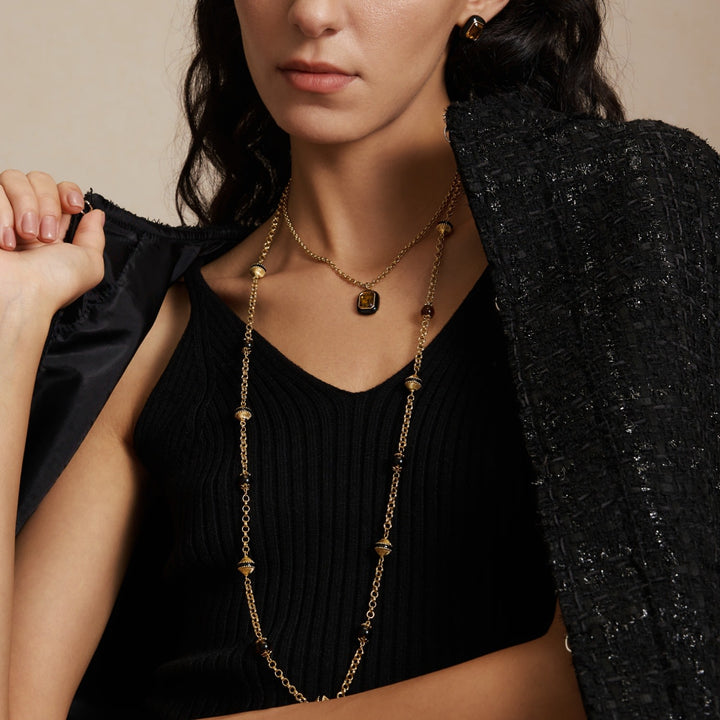 The Roman Brown Sautoir by Retro Chic is a long necklace inspired by Roman architecture. It features seven hand-cut brown gemstones and seven textured metal spheres, creating a layered and vintage-inspired look. The design is enhanced with hand-set gems and intricate black enamel work. With its versatile 109cm length, it can be styled in multiple ways.