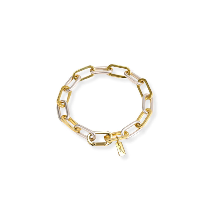 The Nefele Bracelet by Risqué is a bold and unique chain bracelet. Inspired by the goddess Nephele, it features a unique design of two-tone links, combining square and round shapes. It is crafted from 14ct gold-plated recycled sterling silver and stainless steel, and is a symbol of strength and femininity.