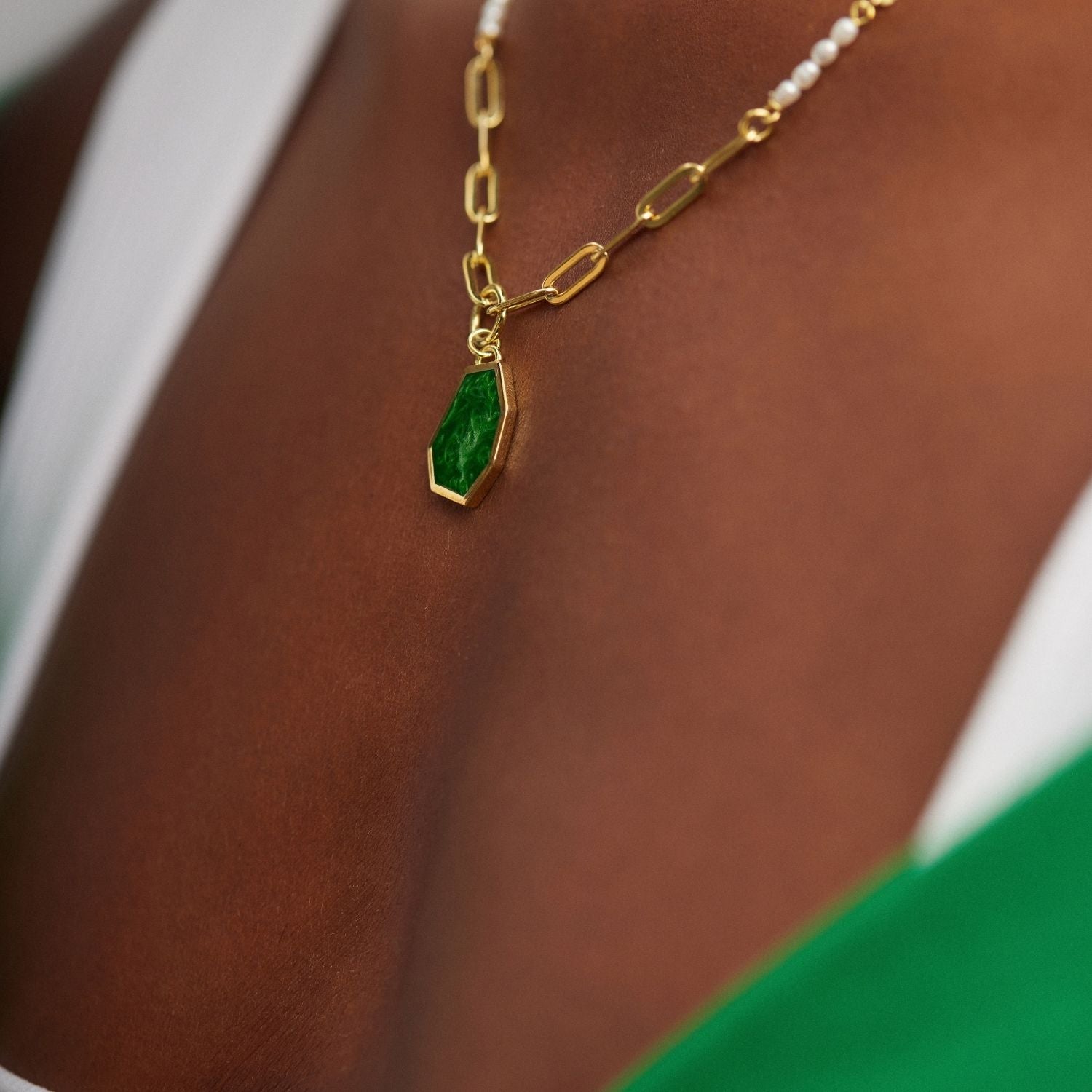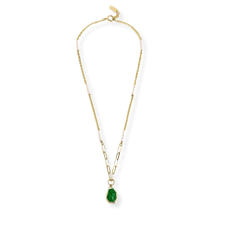 The Demetra Pendant Necklace by Risqué is a captivating and elegant piece. Inspired by the goddess Demetra, this necklace merges nature's elegance and feminine strength. It features a striking polygon-shaped pendant in lush green, symbolizing growth and abundance. The pendant is made from 14-karat gold-plated recycled sterling silver and is adorned with baroque pearls and enamel details.