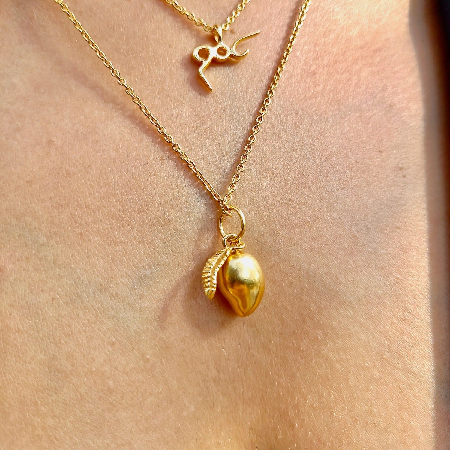 This necklace features a solid silver mango charm with a brushed finish. The charm is made of 22k gold vermeil (2.5 microns) over a recycled sterling silver base (92.5).