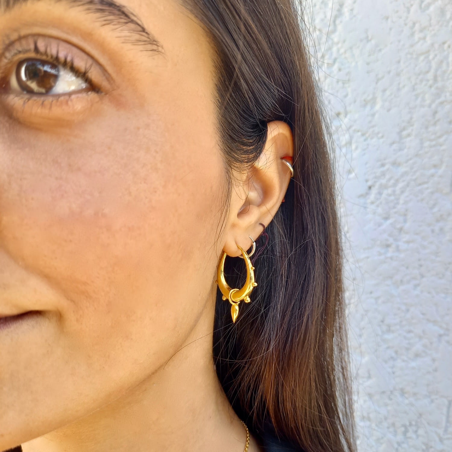 These Tribal Spike Hoops - Gold Plated by Rize are a modern yet timeless accessory with a hint of edgy charm. Handcrafted by Fairtrade artisans, these solid silver hoops are adorned with a stylish spike and intricate granulation balls. They are bold enough to stand out yet versatile enough to complement any outfit. With a satisfying weight of quality, these hoops are a durable and stylish addition to your collection.