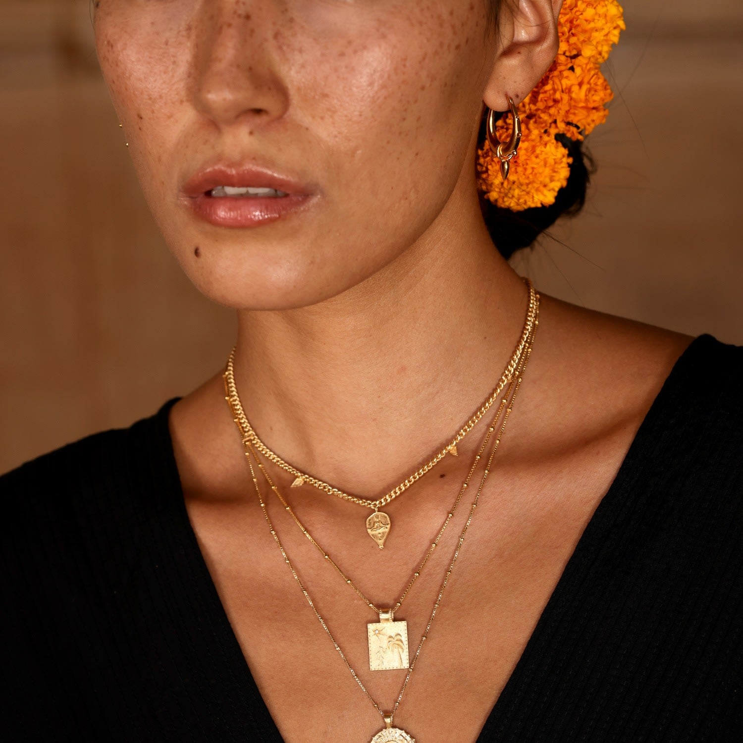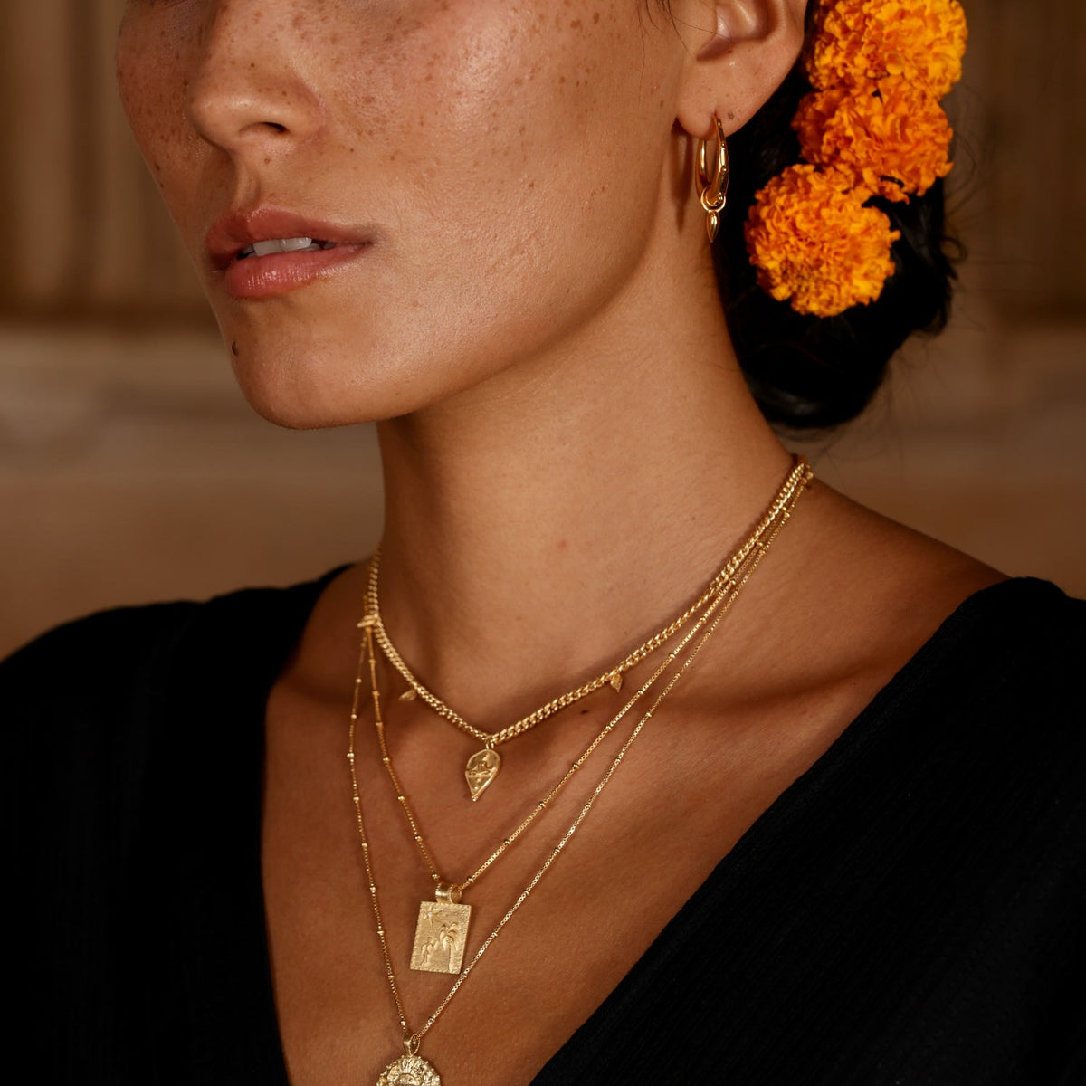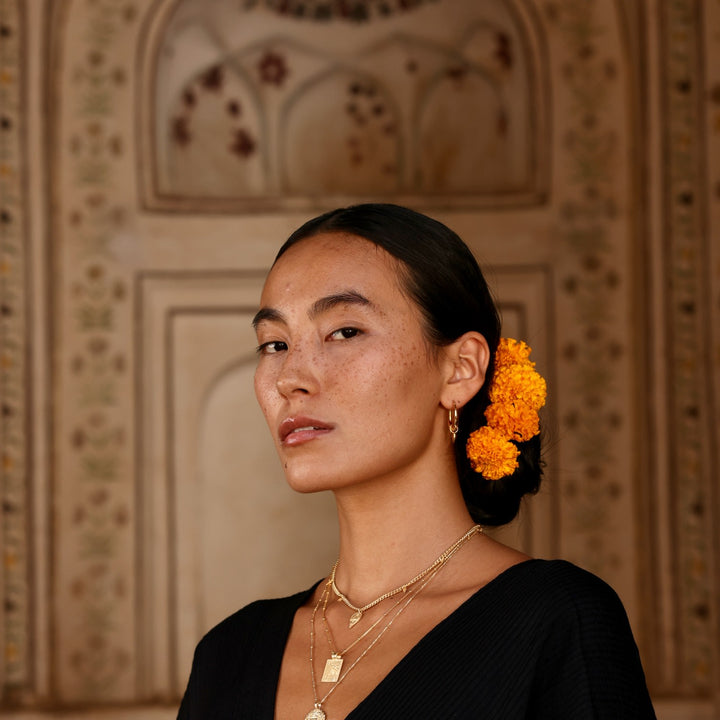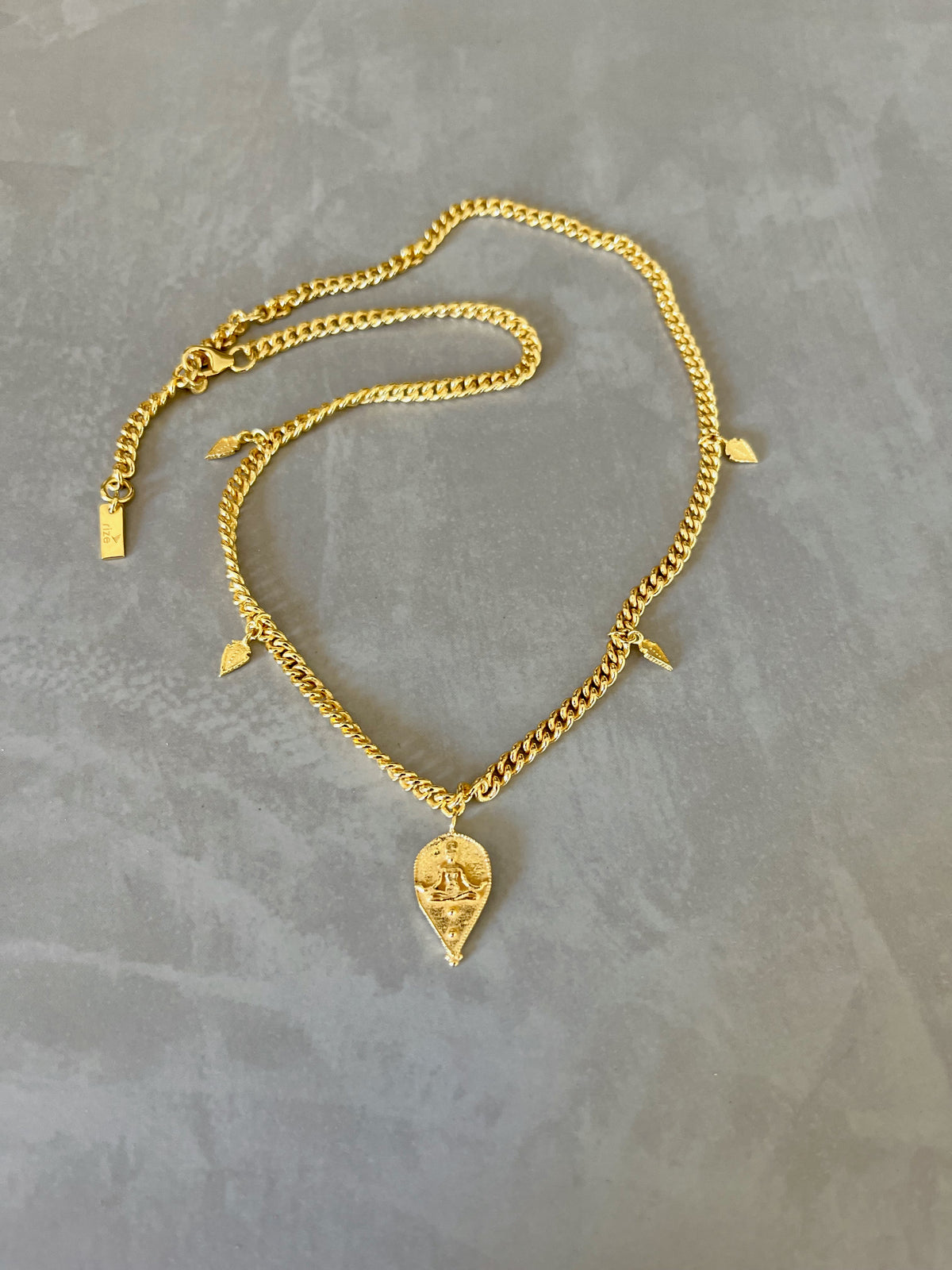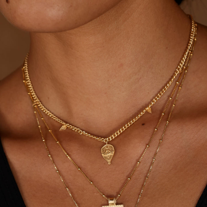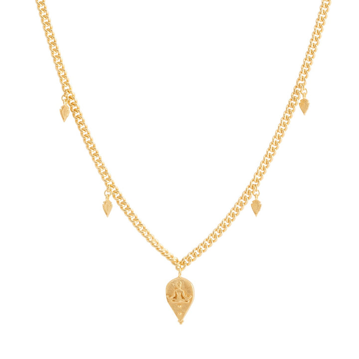 This Goddess Durga Necklace - Gold Plated by Rize is a powerful and meaningful piece. A solid silver curby-style chain holds a central goddess Durga charm, one of the most worshipped goddesses who symbolizes good over evil. The charm is surrounded by tiny amulet arrows that represent positivity for the path ahead. This necklace is a perfect blend of spiritual symbolism and modern design.