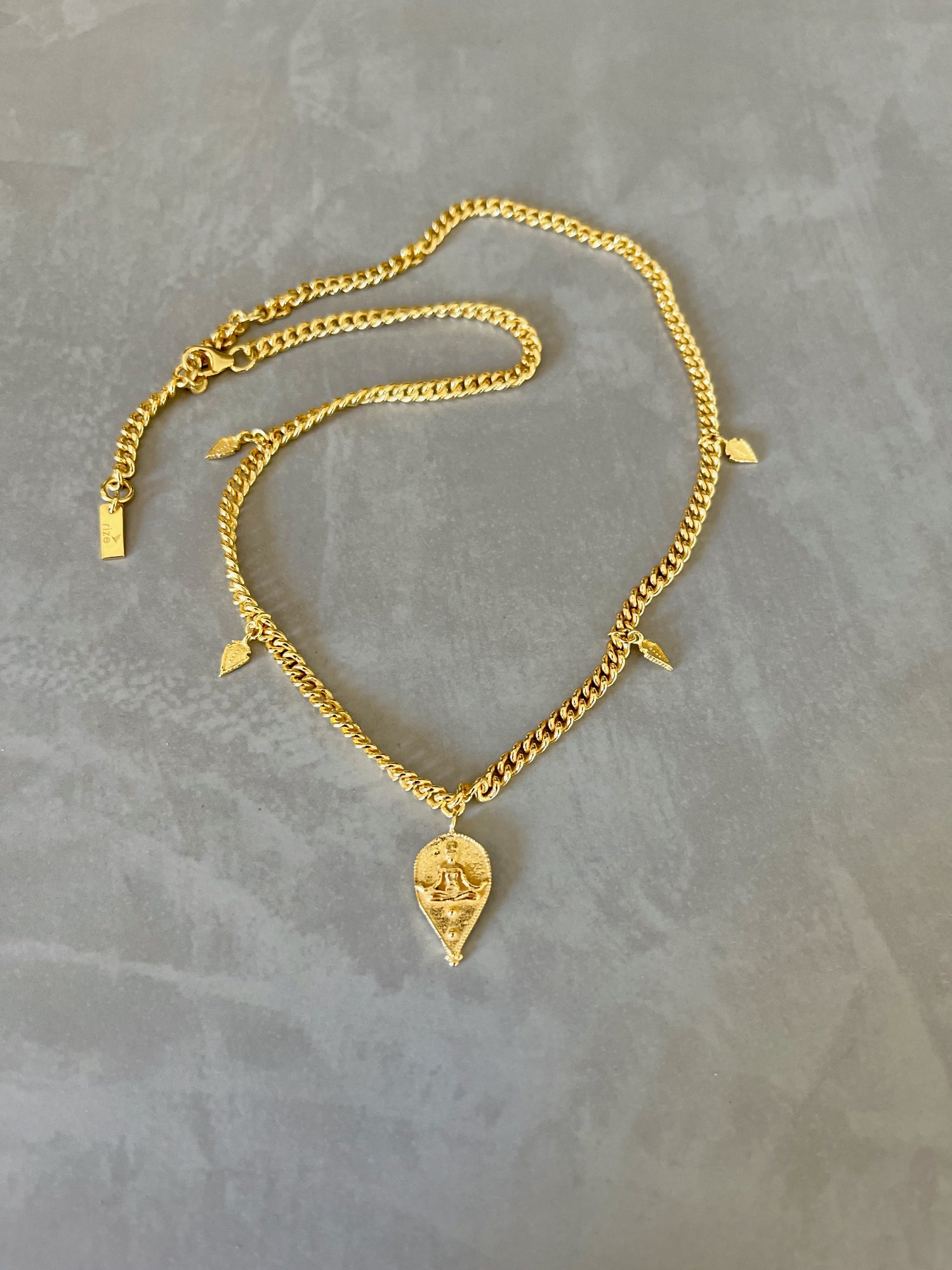 This necklace is made with a 22k gold-plated, recycled sterling silver base. The chain is 14 inches long with a 2-inch extender, and the goddess pendant measures 9mm x 18mm. It is handmade by fairtrade artisans.