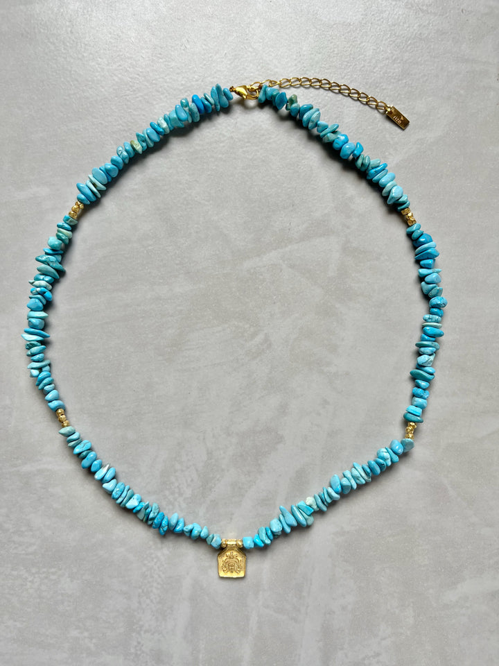 The Turquoise Goddess Necklace by Rize is a beautiful piece that symbolizes good over evil. The necklace features hundreds of natural Turquoise stones that surround a central pendant of Goddess Durga. The spacer beads are 22k gold vermeil, adding a touch of elegance. This necklace is a perfect blend of spiritual symbolism and beautiful design.