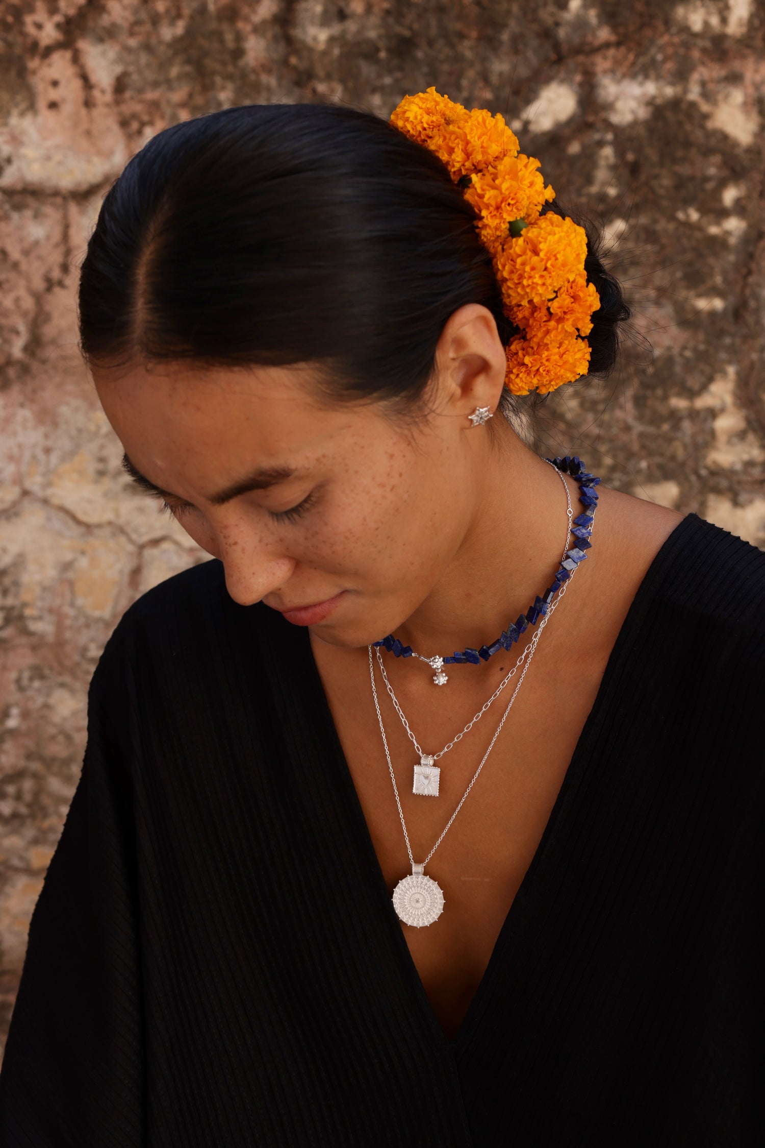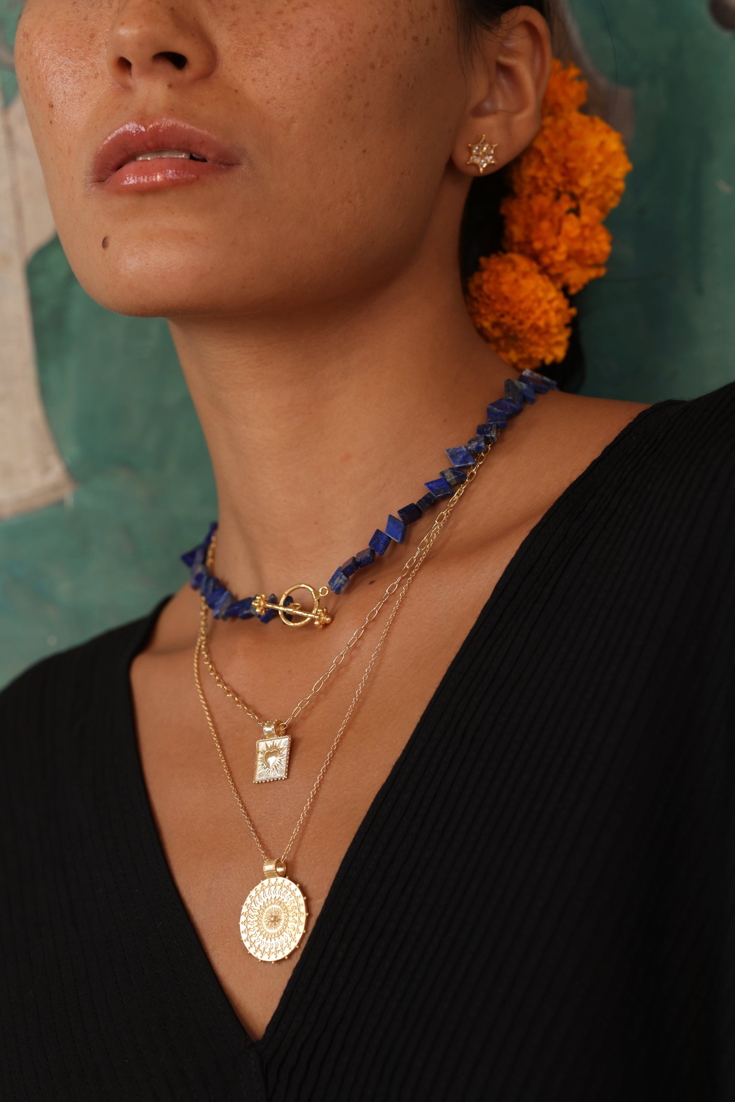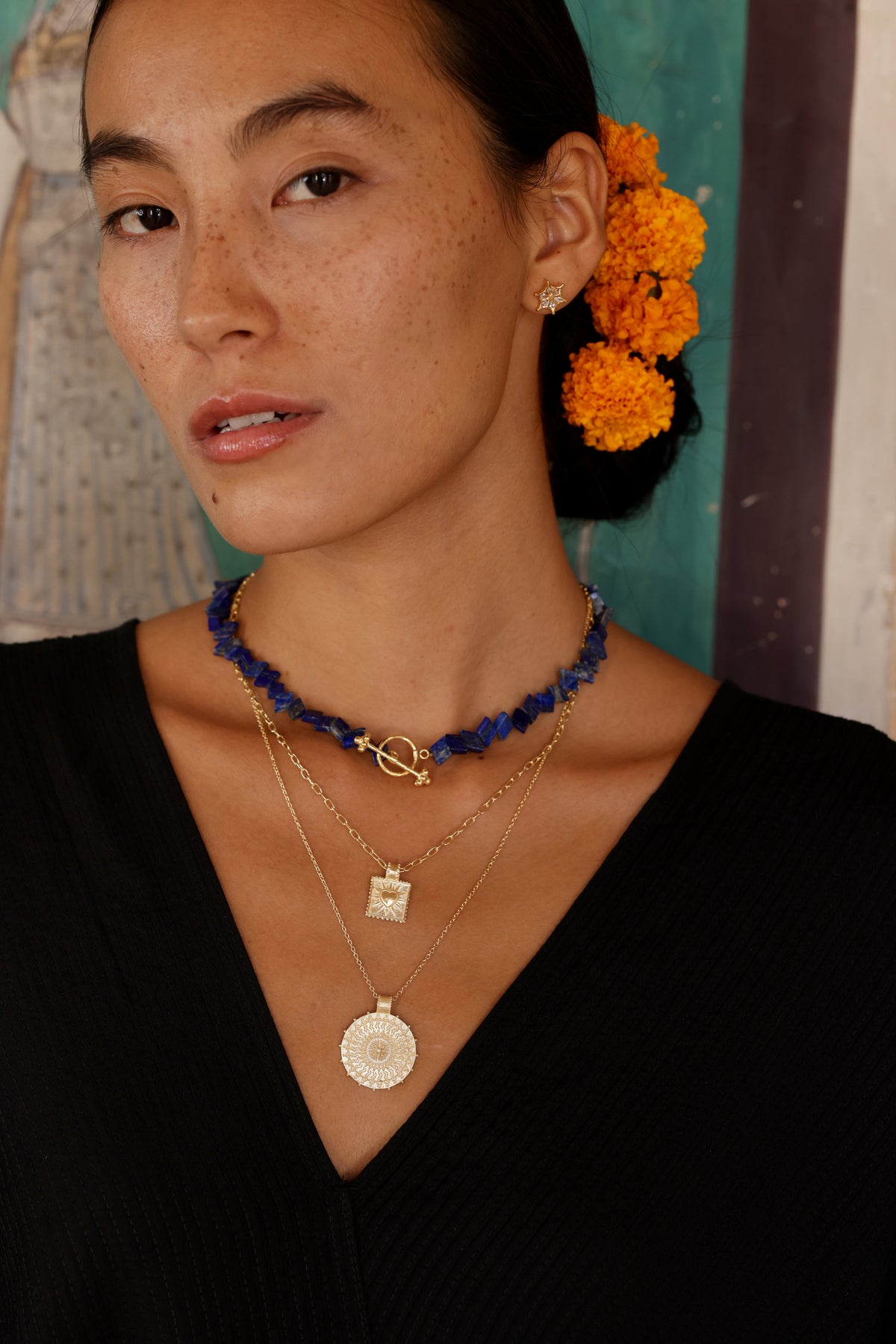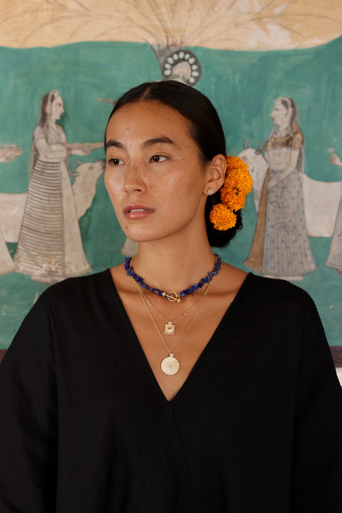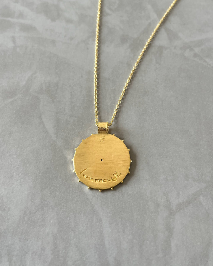 The Tribal Goddess Pendant by Rize is a symbol of female empowerment, depicting a spiral of tribal girls in Warli art style. The pendant features a semi-precious center stone of Clear Quartz and is engraved on the back with "I am enough." Hand-made by Fairtrade artisans in India, this piece is made from recycled sterling silver with a thick layer of 22k Gold vermeil.
