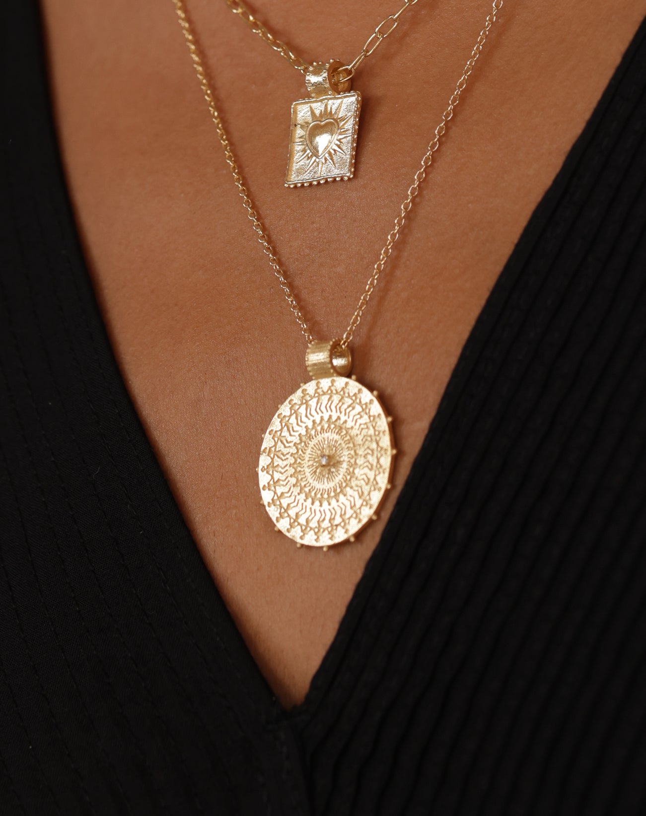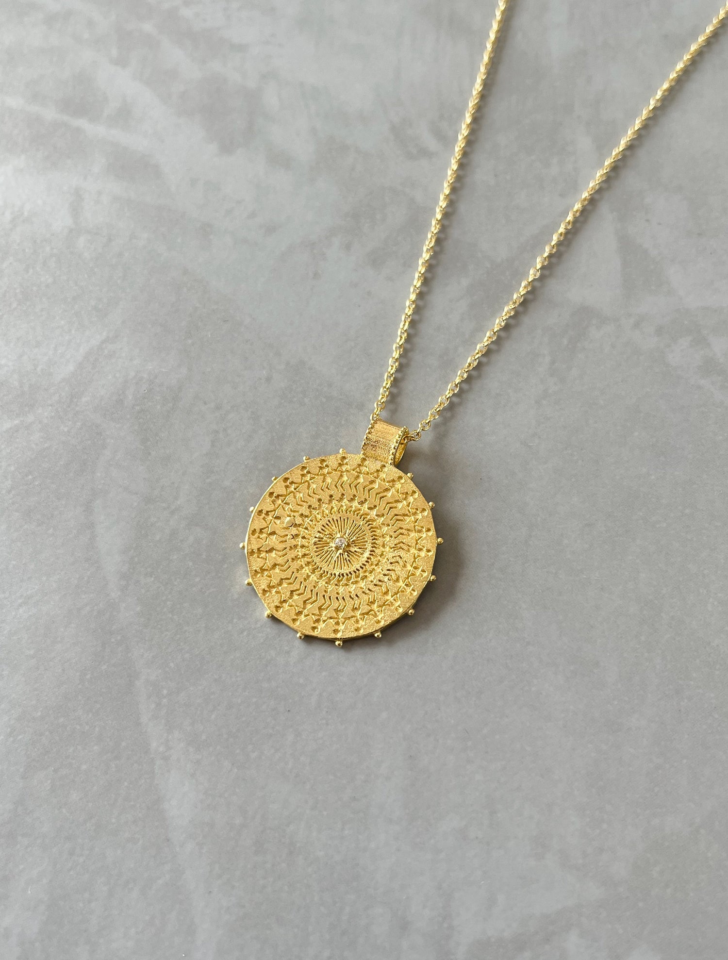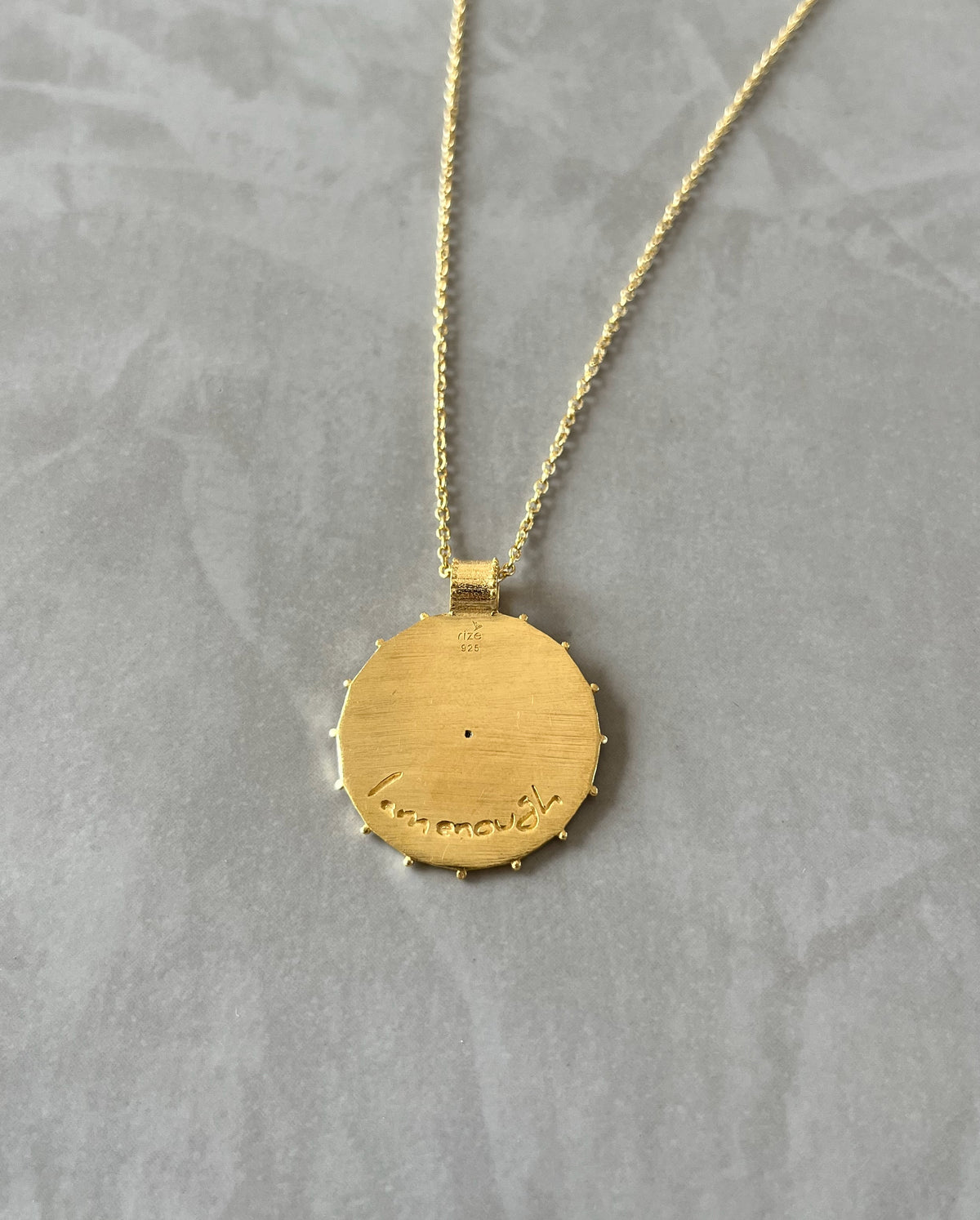 This pendant is crafted from recycled sterling silver base (92.5) with a 22k Gold vermeil (2.5 microns) finish. It features a semi-precious clear Quartz gemstone. The pendant is 27mm wide, and the chain is 18 inches with a 2-inch extender.