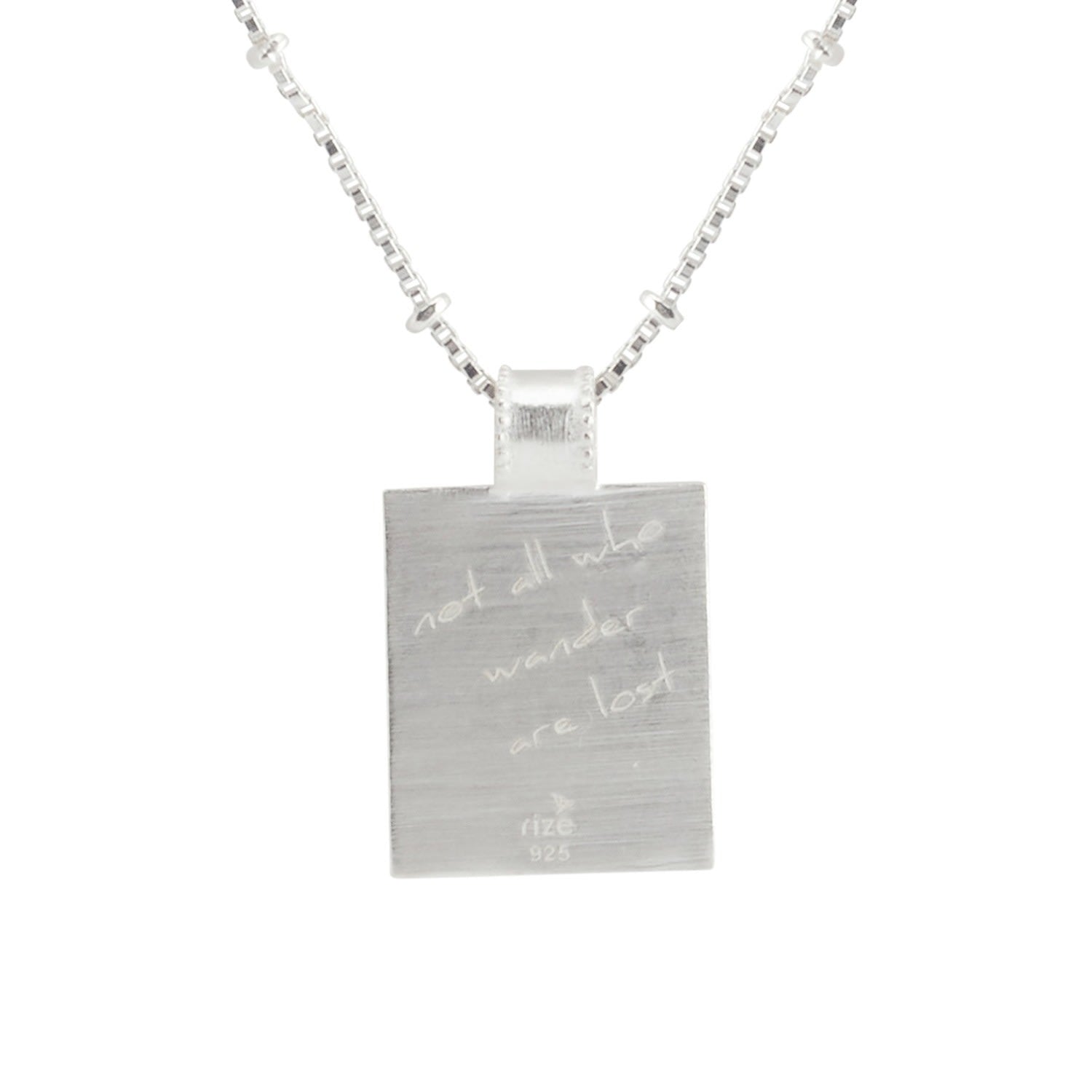 The Voyager Palm Necklace by Rize is a beautiful piece for travelers and wanderers. It features a pendant with a tribal traveler girl under a palm tree and a clear quartz stone at the center. The reverse side is engraved with the quote "not all who wander are lost." The necklace is made from recycled sterling silver by Fairtrade artisans.