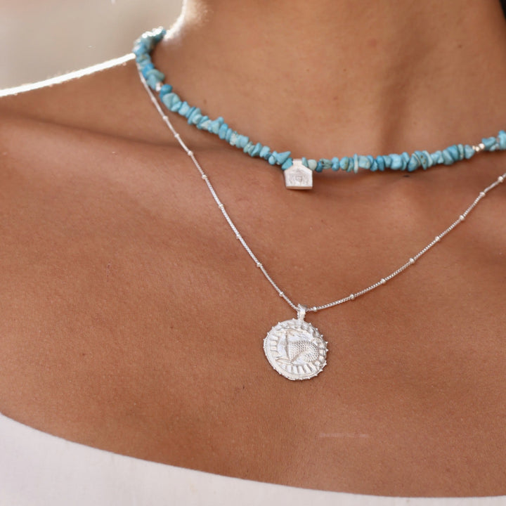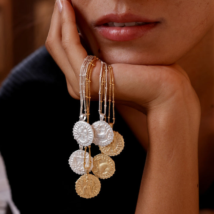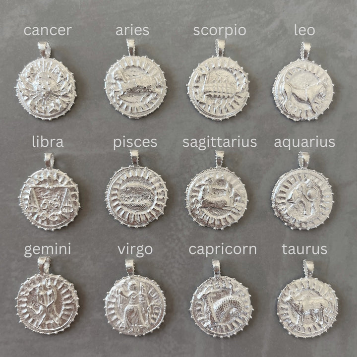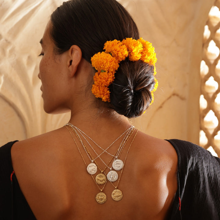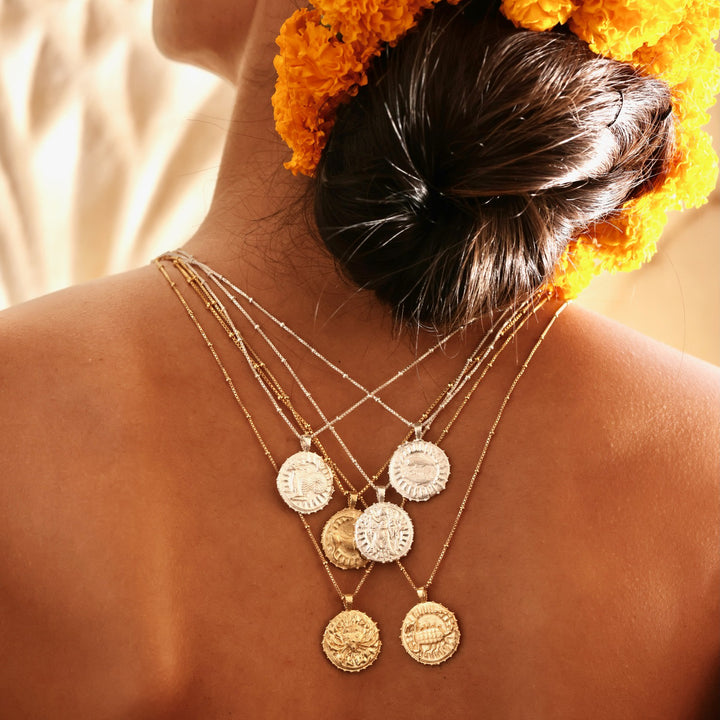 The Virgo Zodiac Manifesting Necklace by Rize is a beautifully handmade and meaningful piece. This double-sided coin pendant features a stunning zodiac design on one side and the auspicious "Sri Yantra" manifesting design on the other, which is believed to help clear negative energy and bring harmony and prosperity. Made by Fairtrade artisans from recycled sterling silver, it is a stylish and powerful tool for personal growth.