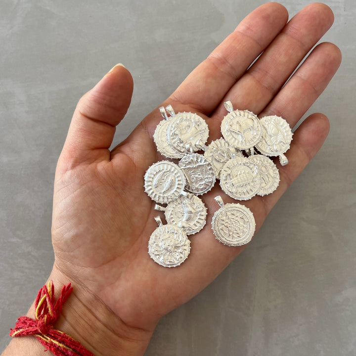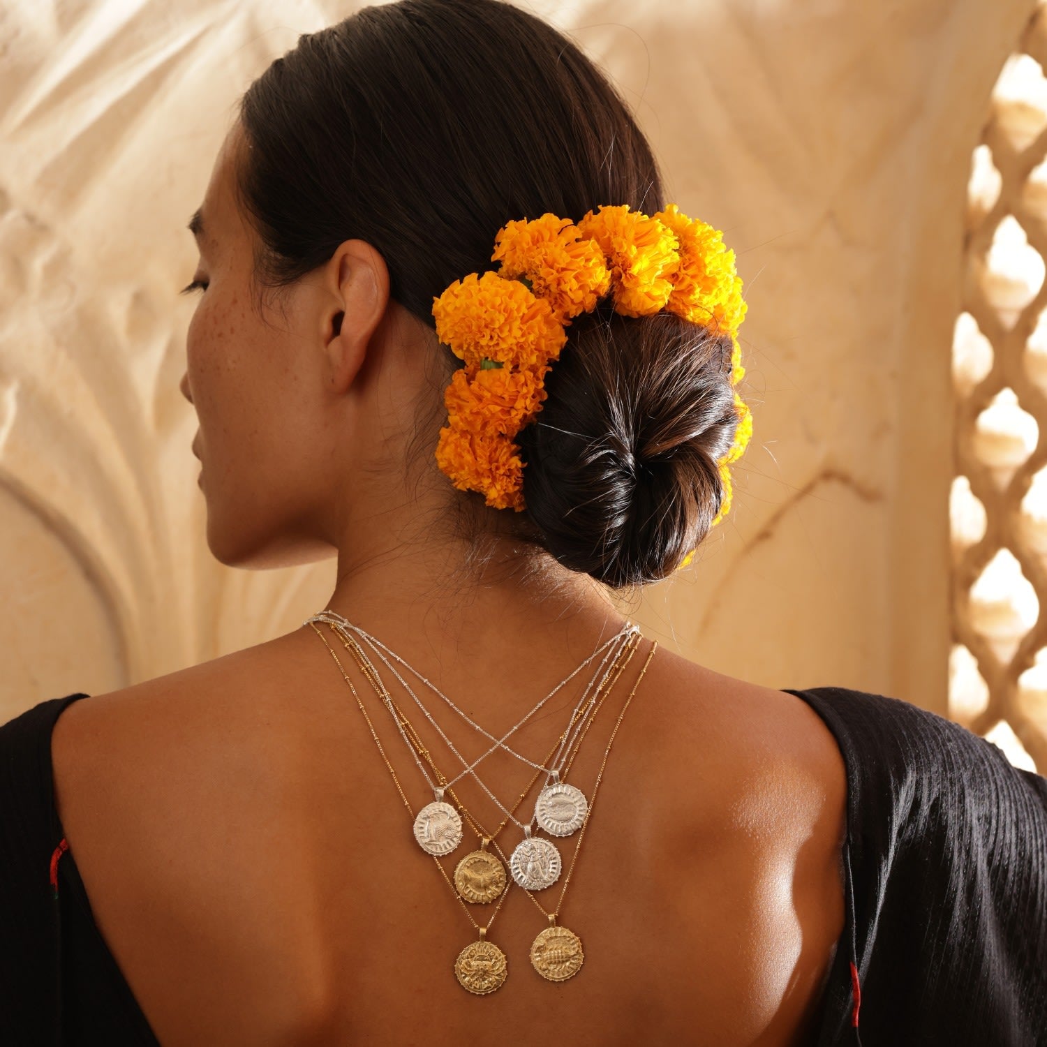 The Taurus Zodiac Manifesting Necklace by Rize is a beautifully handcrafted and meaningful accessory. This double-sided coin pendant features a stunning zodiac design on one side and the auspicious "Sri Yantra" manifesting design on the other, which is believed to help clear negative energy and bring harmony and prosperity. Made by Fairtrade artisans from recycled sterling silver, it is a stylish and powerful tool for personal growth.