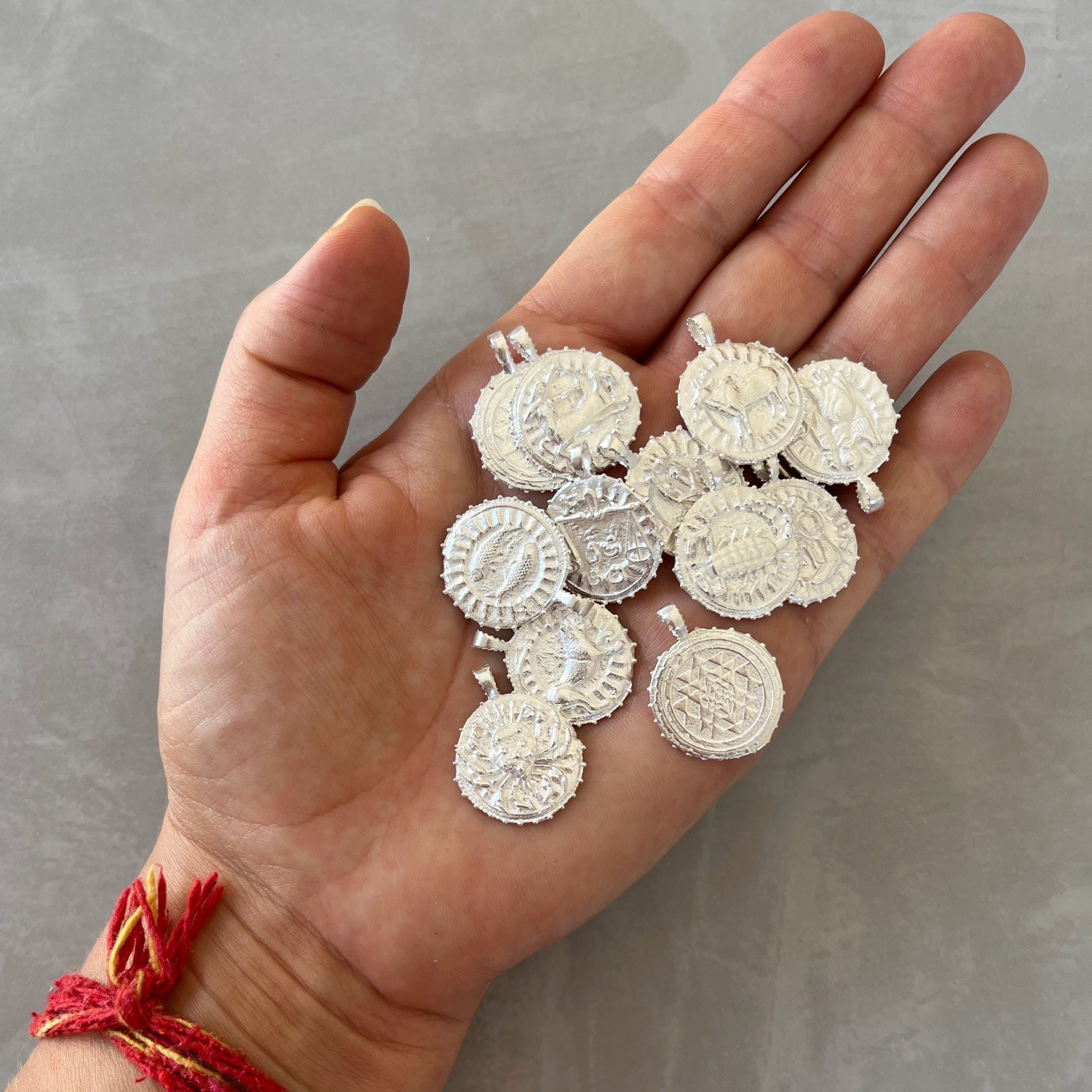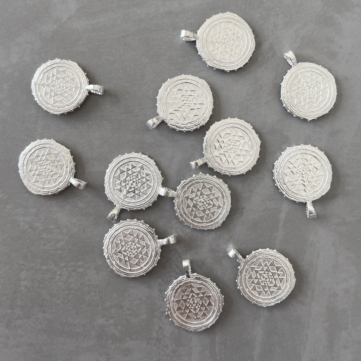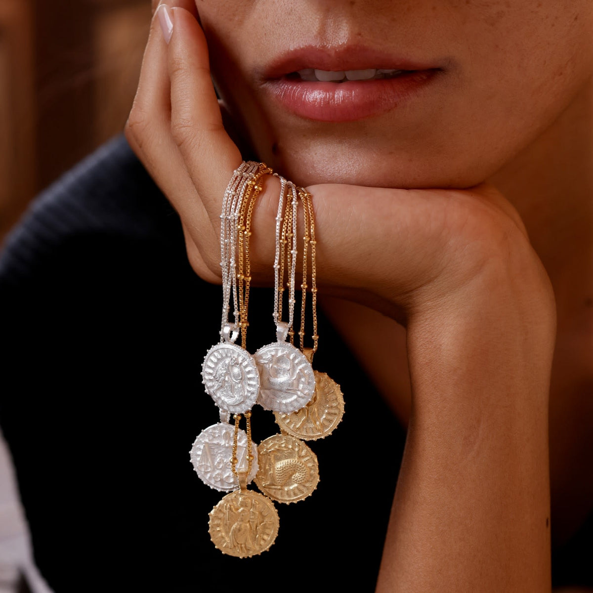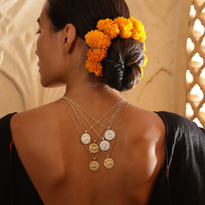 The Pisces Zodiac Manifesting Necklace by Rize is a beautifully handcrafted and meaningful accessory. This double-sided coin pendant features a stunning zodiac design on one side and the auspicious "Sri Yantra" manifesting design on the other, which is believed to help clear negative energy and bring harmony and prosperity. Made by Fairtrade artisans from recycled sterling silver, it is a stylish and powerful tool for personal growth.
