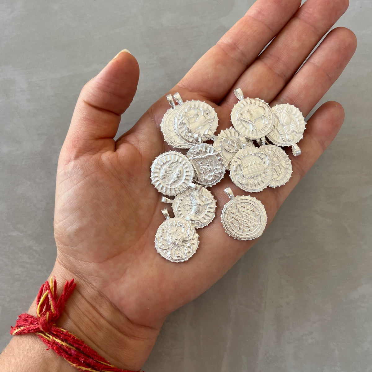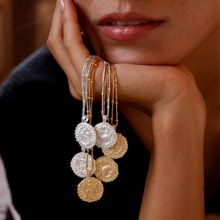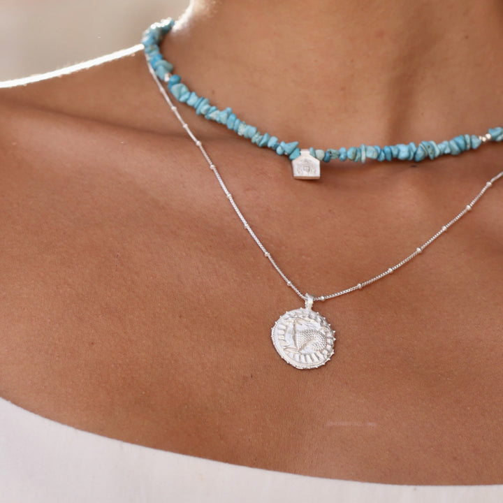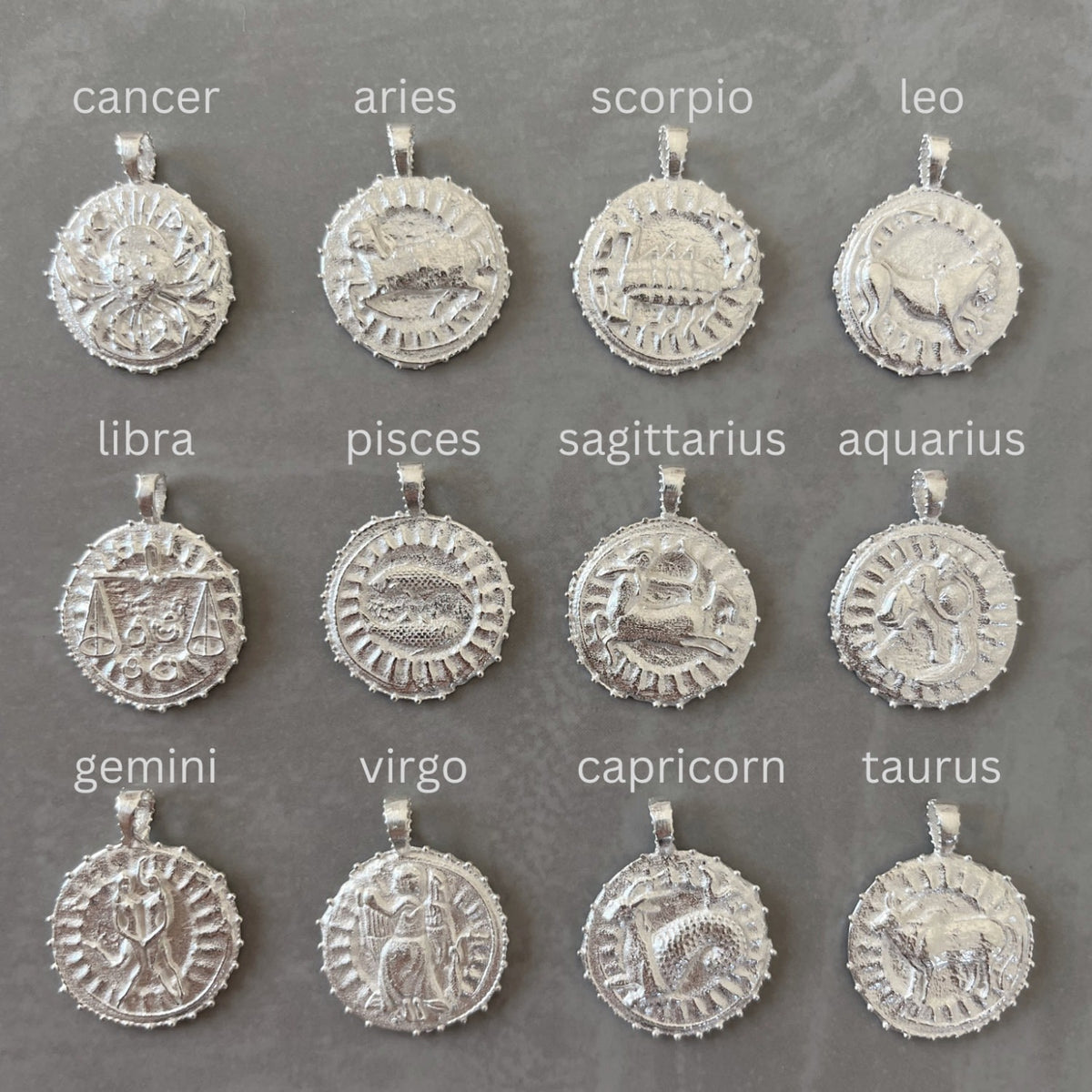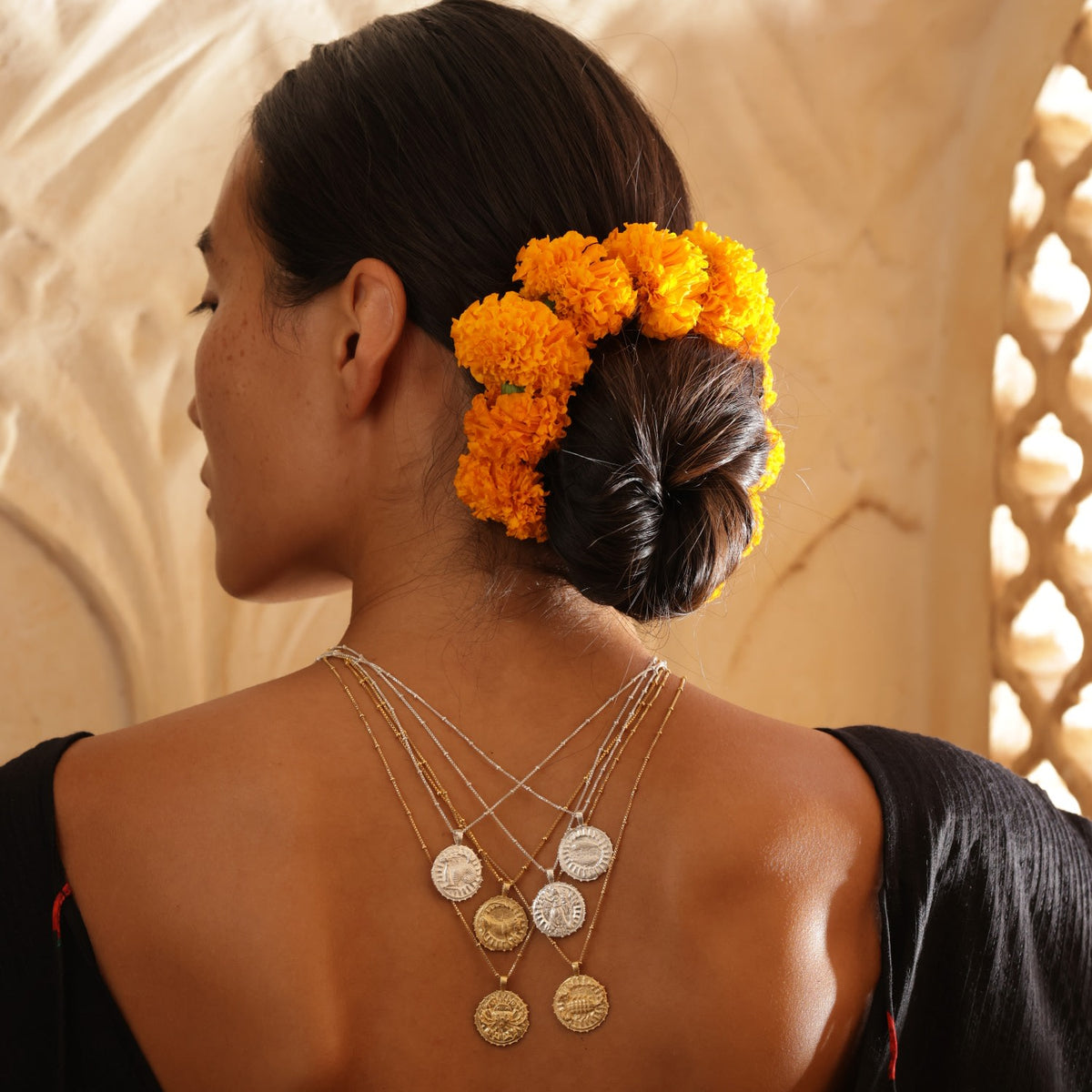 The Scorpio Zodiac Manifesting Necklace by Rize is a beautifully handmade and meaningful accessory. This double-sided coin pendant features a stunning zodiac design on one side and the auspicious "Sri Yantra" manifesting design on the other, which is believed to help clear negative energy and bring harmony and prosperity. Made by Fairtrade artisans from recycled sterling silver, it is a stylish and powerful tool for personal growth.