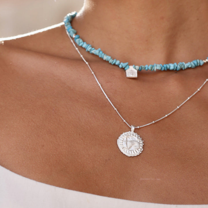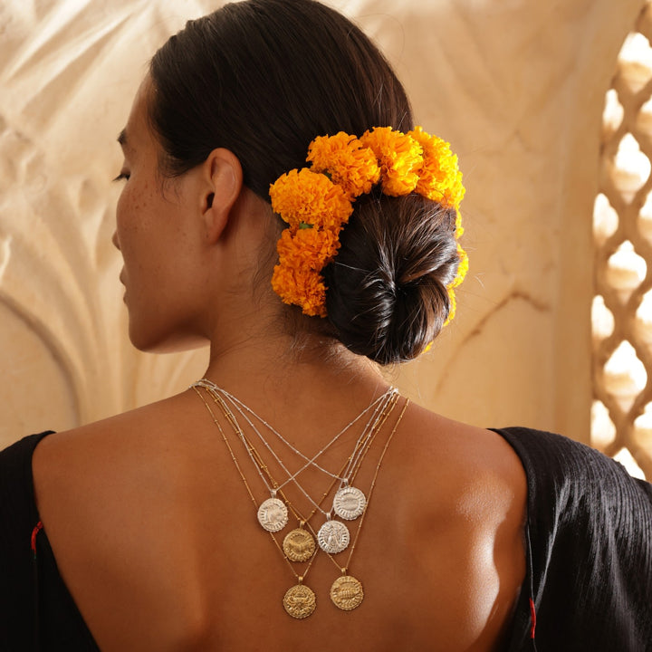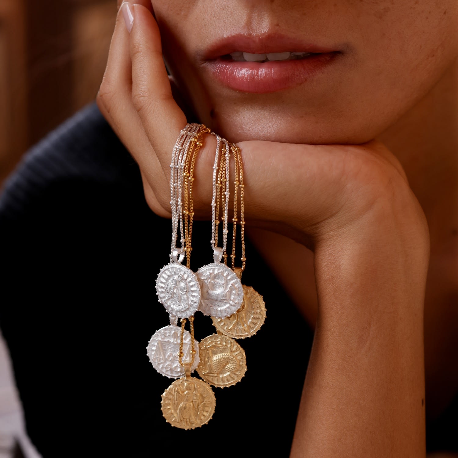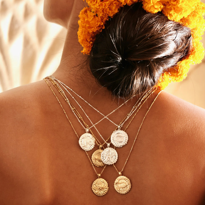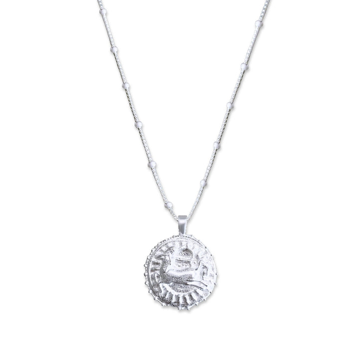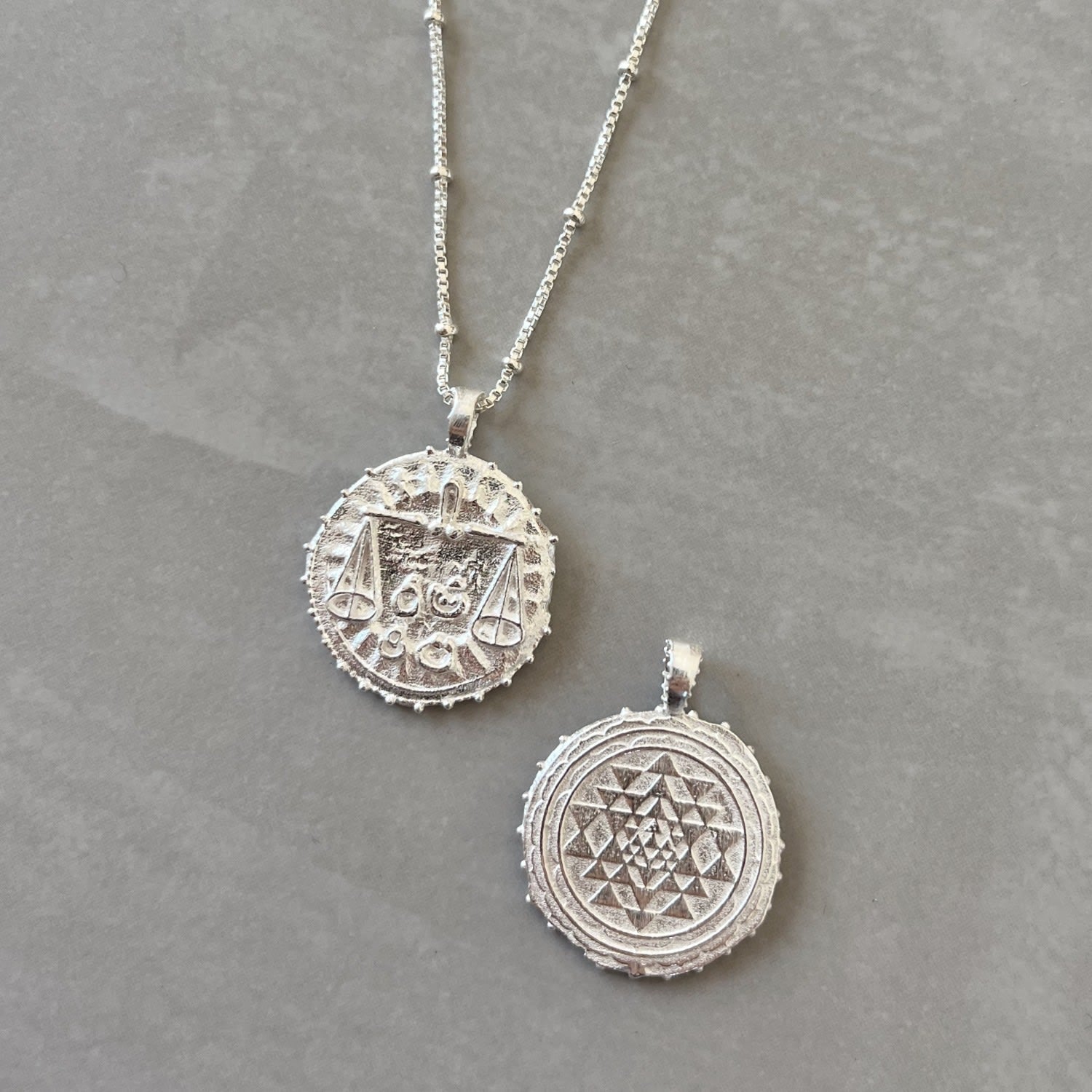 The Sagittarius Zodiac Manifesting Necklace by Rize is a beautifully handcrafted and meaningful accessory. This double-sided coin pendant features a stunning zodiac design on one side and the auspicious "Sri Yantra" manifesting design on the other, which is believed to help clear negative energy and bring harmony and prosperity. Made by Fairtrade artisans from recycled sterling silver, it is a stylish and powerful tool for personal growth.