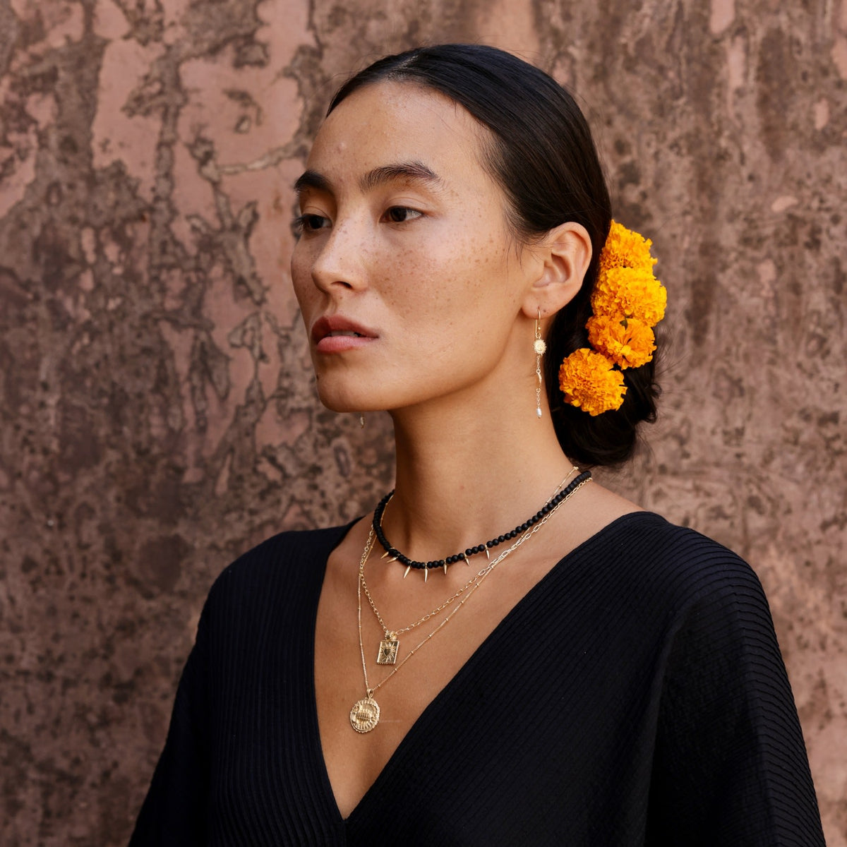This double-sided pendant is handcrafted from 22-karat gold vermeil over a recycled sterling silver base. The pendant measures 17mm x 17mm and hangs on an 18-inch chain with a 2-inch extender.