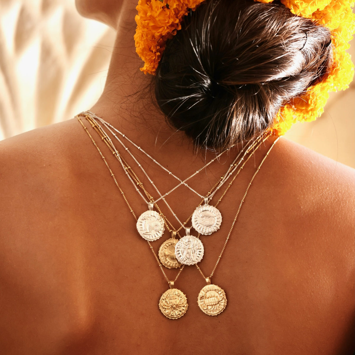 This Virgo Zodiac Manifesting Necklace by Rize is a beautifully handcrafted pendant that combines personal symbolism with positive energy. One side features a stunning Virgo zodiac design based on an ancient coin, while the other side has the powerful "Sri Yantra" manifesting design, which helps to clear negative energy and attract prosperity. This double-sided necklace is a personal and spiritual talisman, perfect for those who want to wear a piece that is both stylish and meaningful.