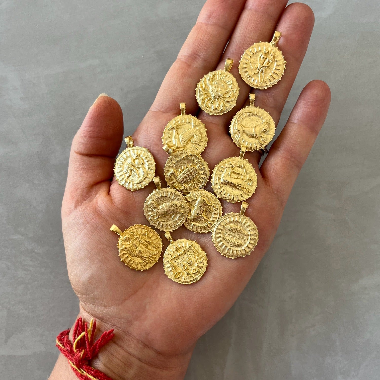 This double-sided pendant is handcrafted from 22-karat gold vermeil over a recycled sterling silver base. The pendant measures 17mm x 17mm and hangs on an 18-inch chain with a 2-inch extender.
