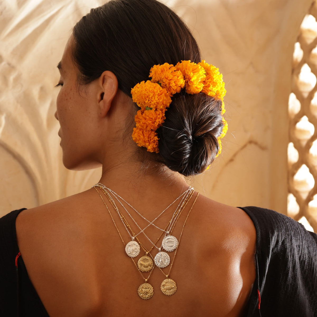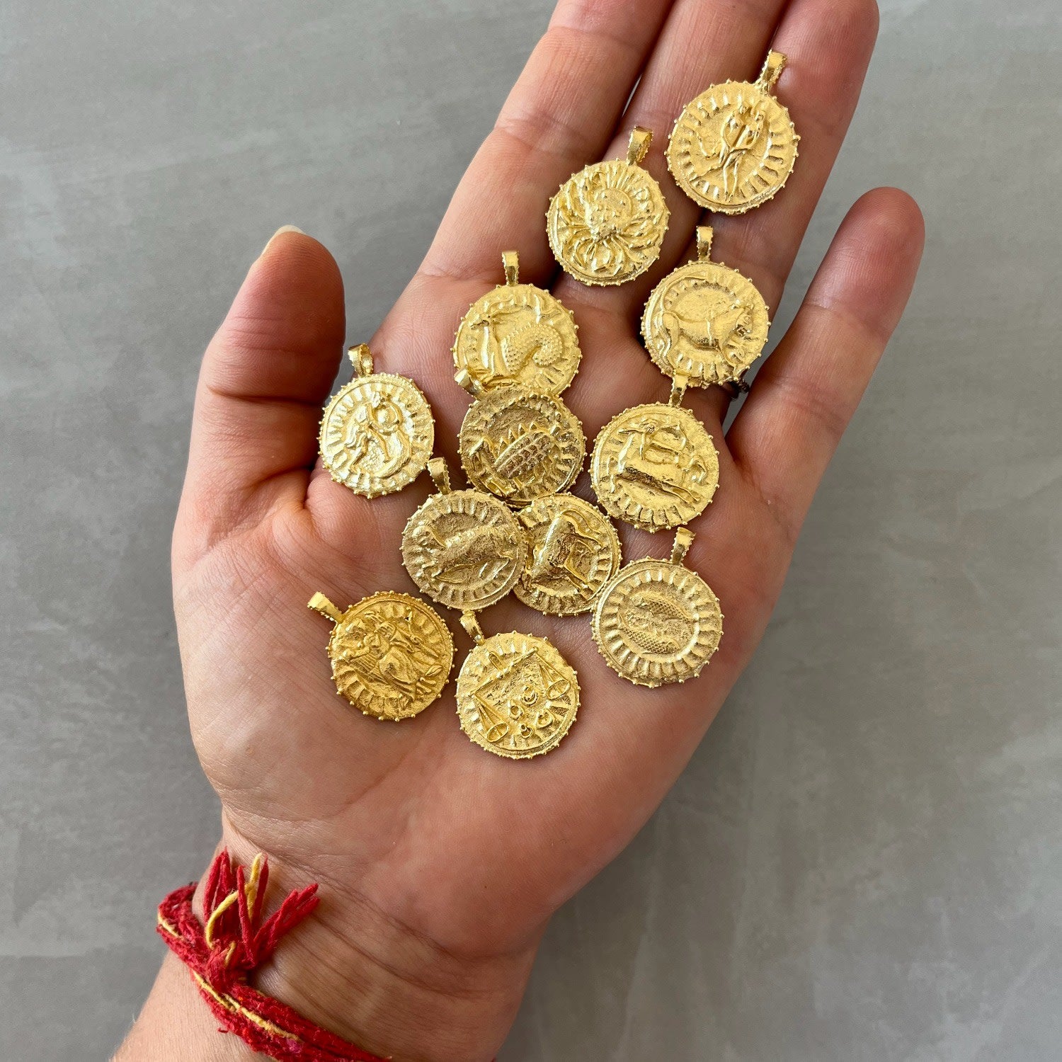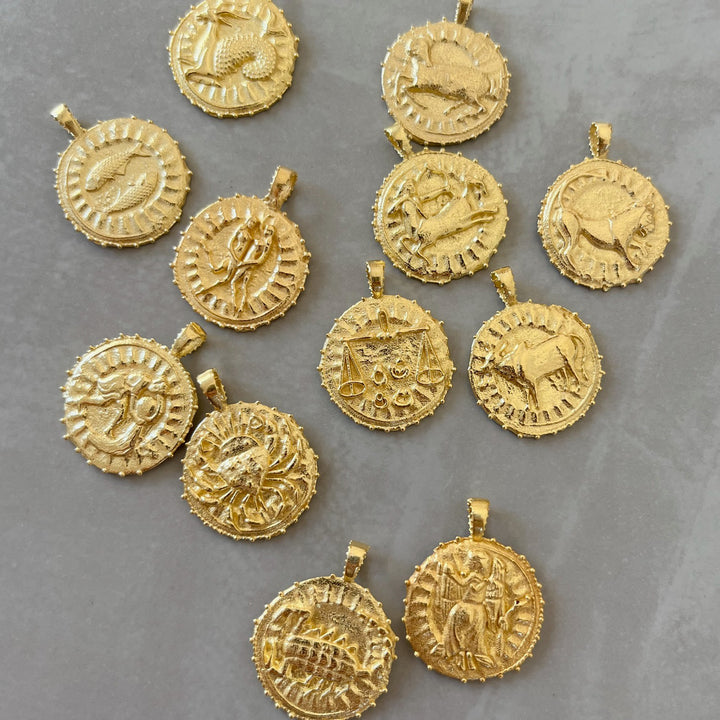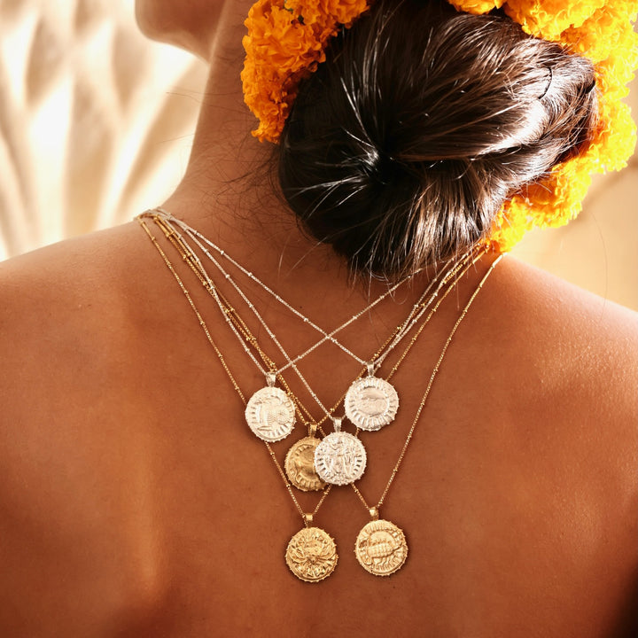 This Gemini Zodiac Manifesting Necklace by Rize is a beautifully handcrafted double-sided pendant. One side features a stunning zodiac design based on an ancient coin, while the other side showcases the powerful "Sri Yantra" manifesting design, which is believed to attract harmony, prosperity, and wealth. This piece is a personal talisman, connecting you to your zodiac sign and spiritual intention, making it a unique and meaningful accessory.