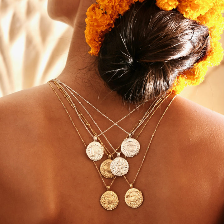 The Sagittarius Zodiac Manifesting Necklace by Rize is a beautifully handcrafted, double-sided pendant that is both personal and spiritual. One side features a stunning zodiac design based on an ancient coin, while the other side has the powerful "Sri Yantra" manifesting design, which helps to attract harmony, prosperity, and wealth. This necklace is a perfect gift for a Sagittarius, offering a wearable talisman of positive energy.