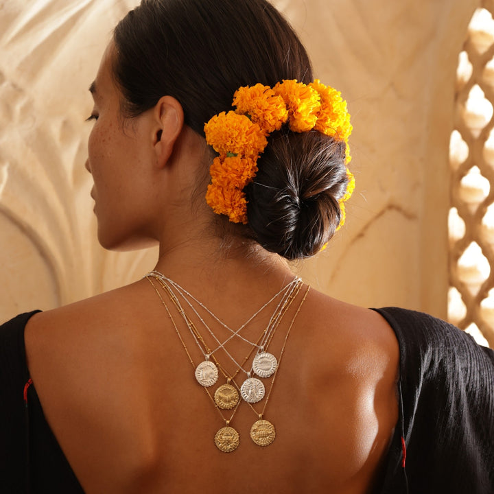 The Scorpio Zodiac Manifesting Necklace by Rize is a beautifully handmade, double-sided pendant that is both personal and spiritual. One side features a stunning zodiac design based on an ancient coin, while the other side has the powerful "Sri Yantra" manifesting design, which helps to attract harmony and prosperity. This necklace is a perfect gift for a Scorpio, offering a wearable talisman of positive energy.