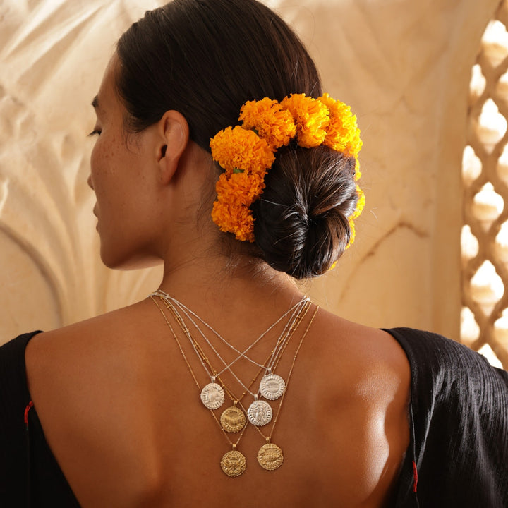 The Pisces Zodiac Manifesting Necklace by Rize is a beautifully handmade, double-sided pendant. One side features a stunning Pisces zodiac design based on an ancient coin, while the other side has the powerful "Sri Yantra" manifesting design, which helps clear negative energy and attract harmony and prosperity. This necklace is a thoughtful gift for a Pisces, offering a wearable talisman of positive energy.