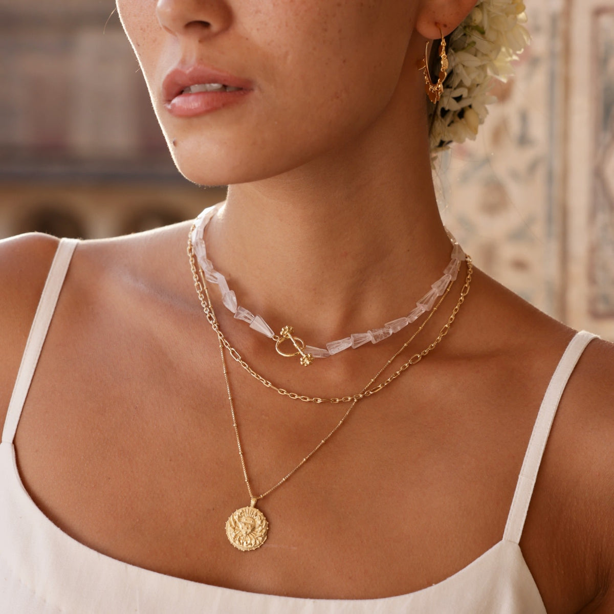 This double-sided pendant is handcrafted from 22-karat gold vermeil (2.5 microns) over a recycled sterling silver base. The pendant is approximately 17mm x 17mm and hangs on an 18-inch chain with a 2-inch extender.