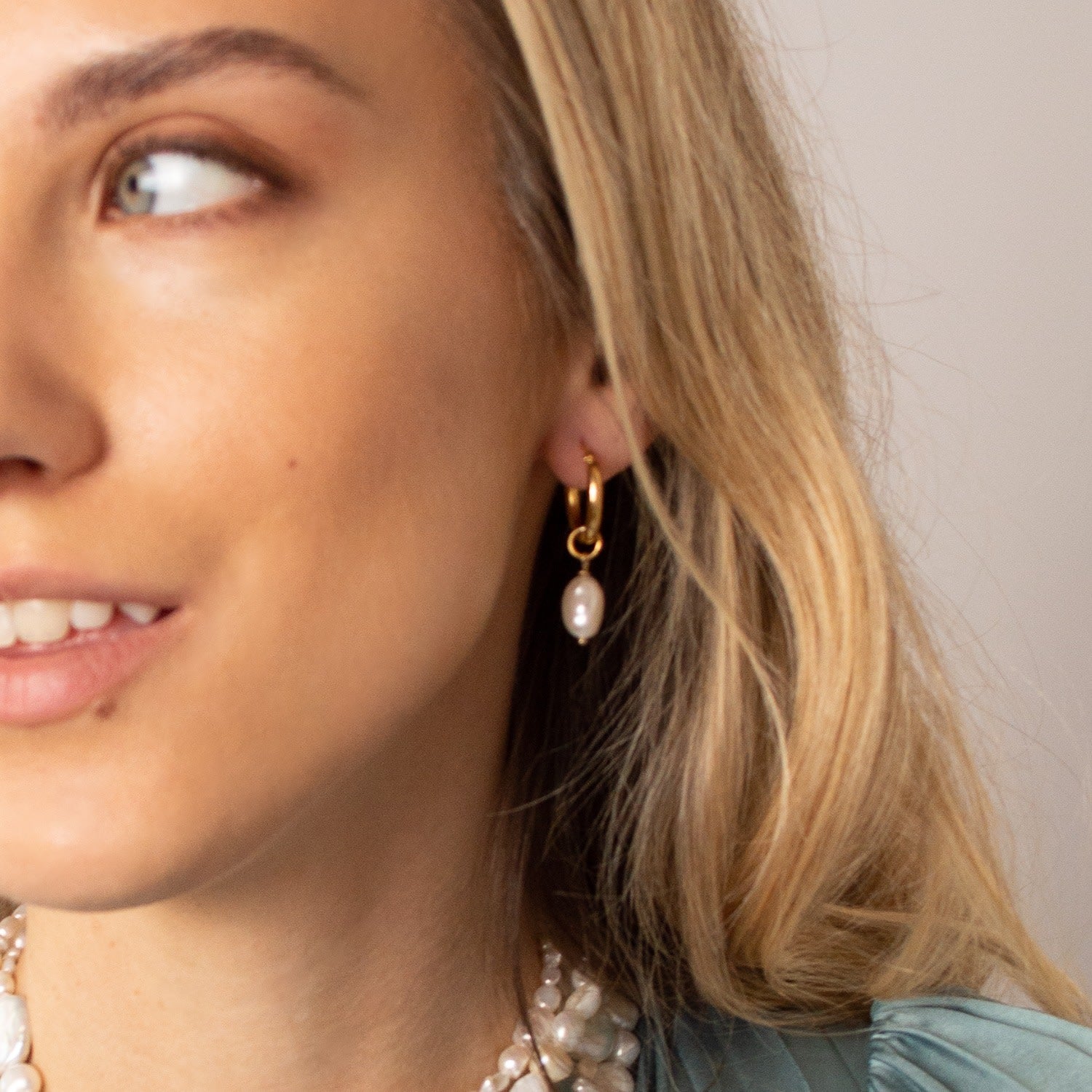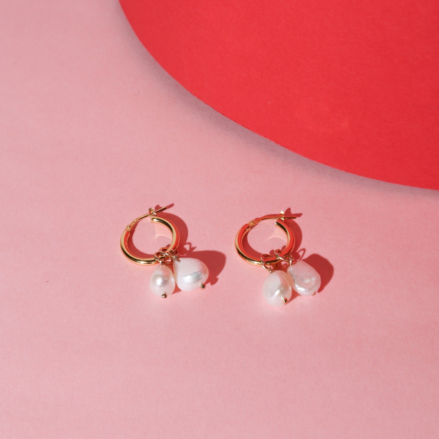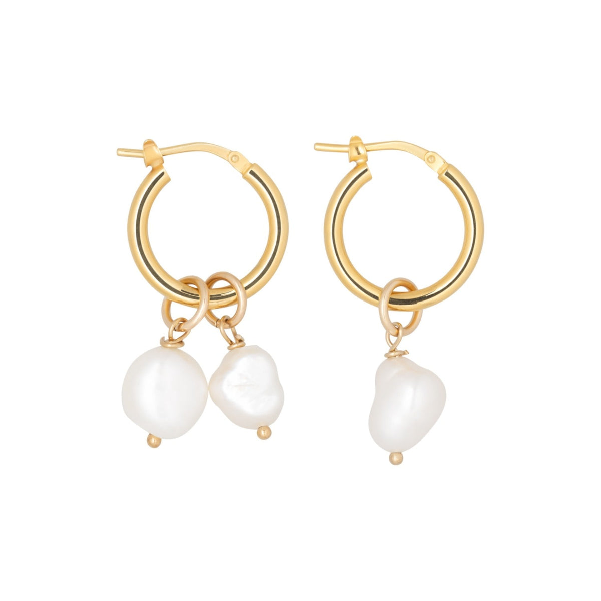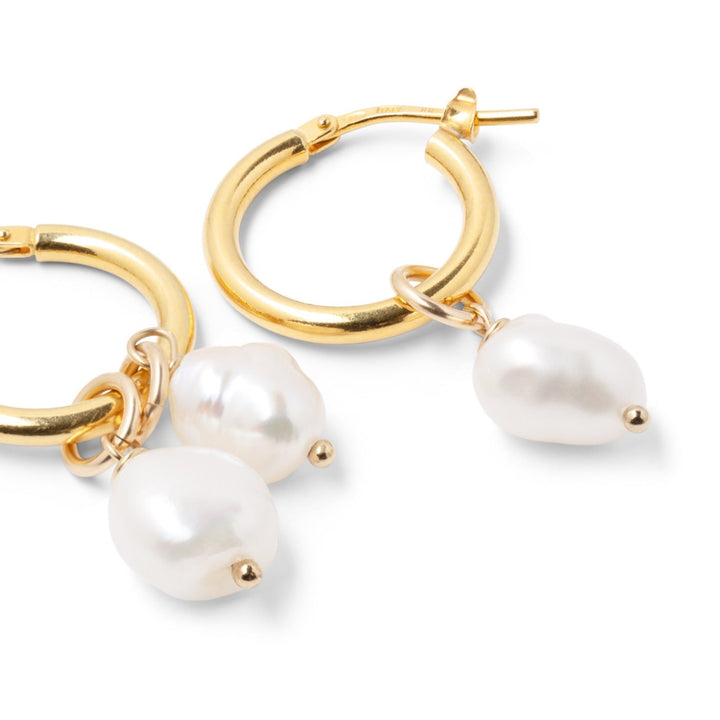 These hoop earrings are crafted from 18k gold-plated brass and freshwater pearls. The hoops measure 12mm.