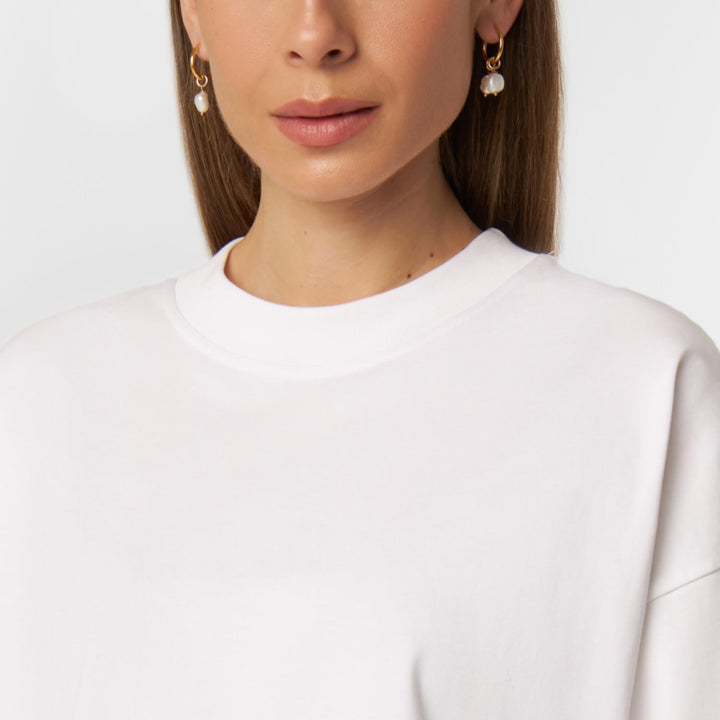 These Julie & Nathi Hoops by Romantico Romantico Studios are a classic and charming accessory. These hoops are comprised of thin, palladium-plated hoops with a freshwater pearl on one side and two on the other. The unique shapes of the freshwater pearls make each pair one-of-a-kind.