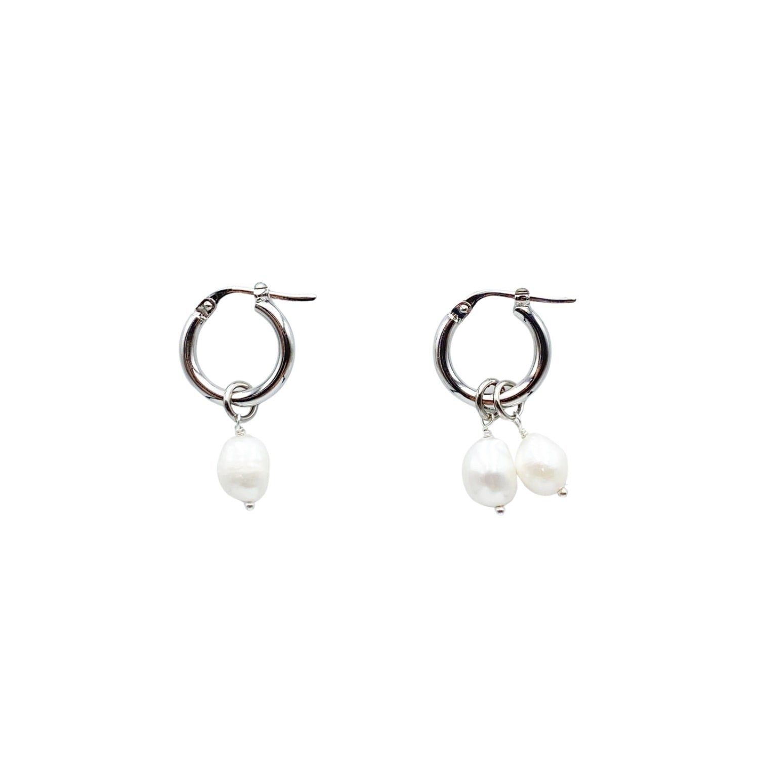 These hoop earrings are crafted from palladium-plated brass and freshwater pearls. The hoops measure 12mm.