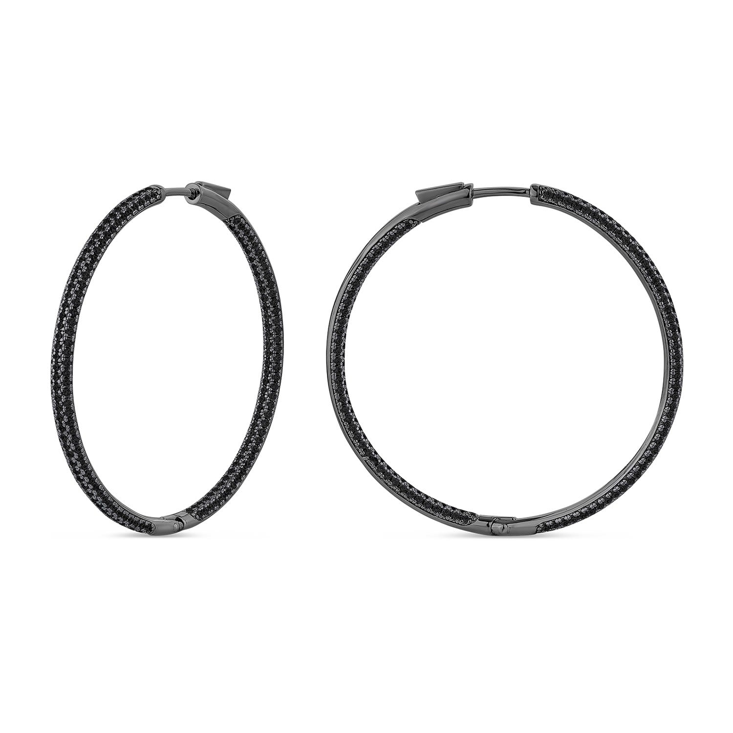 Handcrafted from solid 925 sterling silver with a premium black rhodium plate, these hoops are adorned with hand-set man-made black diamonds in a pave setting. The design is hypoallergenic.