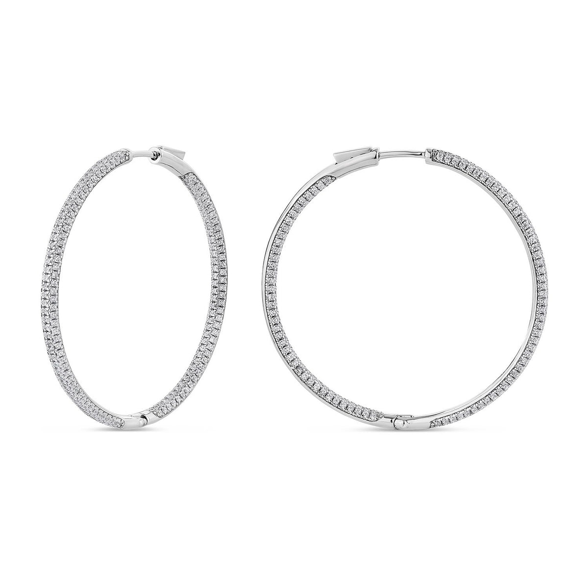 Handcrafted from solid 925 sterling silver with a premium silver rhodium plate, these hoops are adorned with hand-set man-made white diamonds. The design is hypoallergenic.