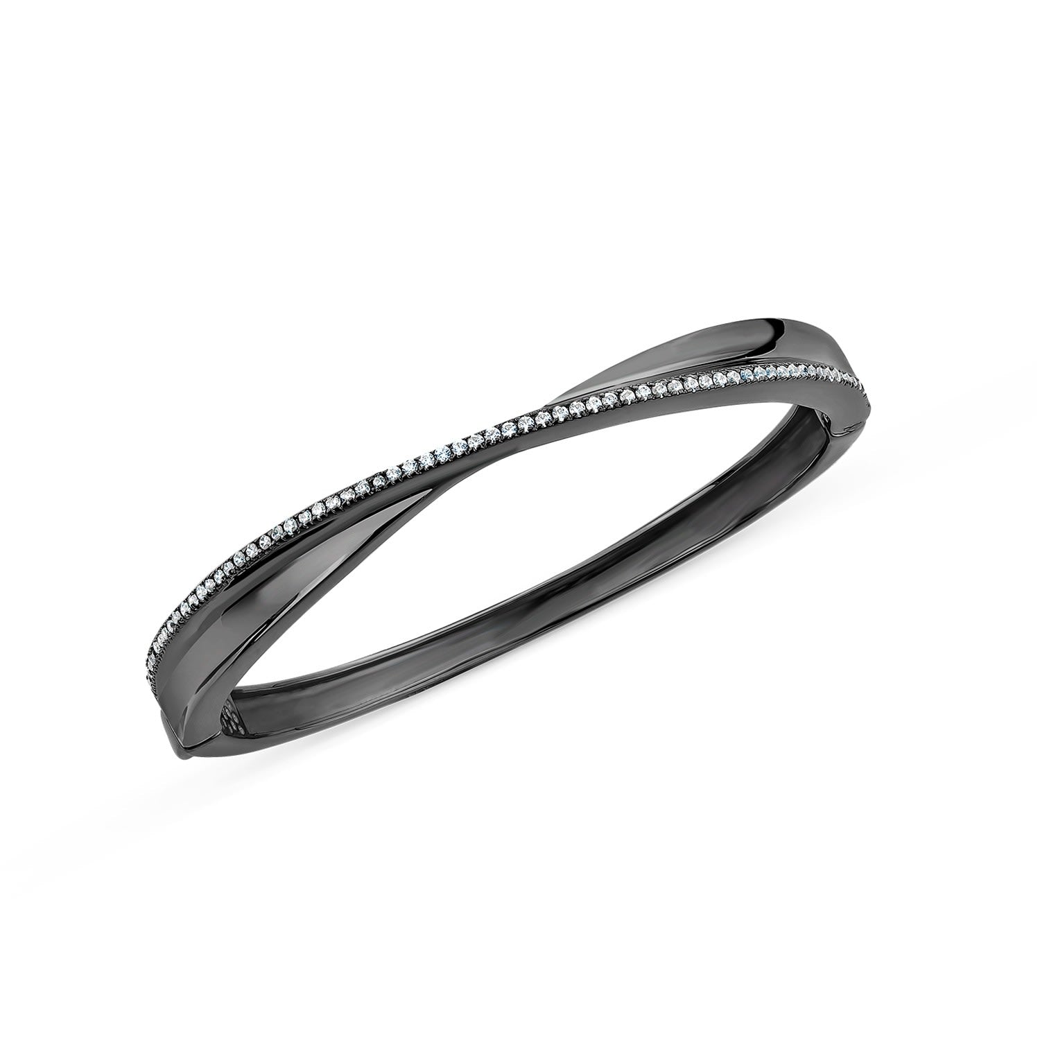This bangle is handcrafted from solid 925 sterling silver with premium black rhodium plate. It features man-made white diamonds in a micro-pave setting. The piece is hypoallergenic.