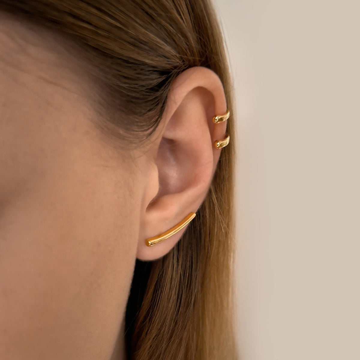 This ear climber is handcrafted from a 925 sterling silver base with 18K gold vermeil. It is hypoallergenic and made with sustainably sourced and developed materials.