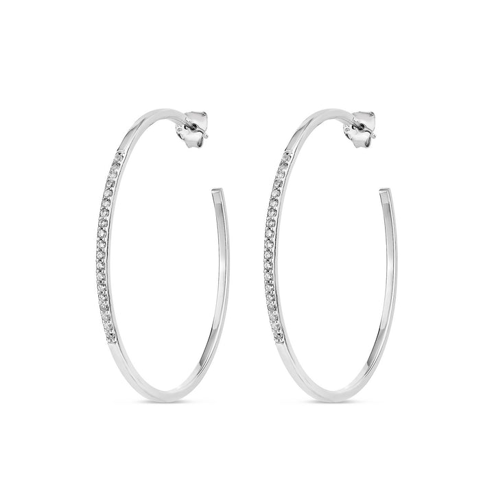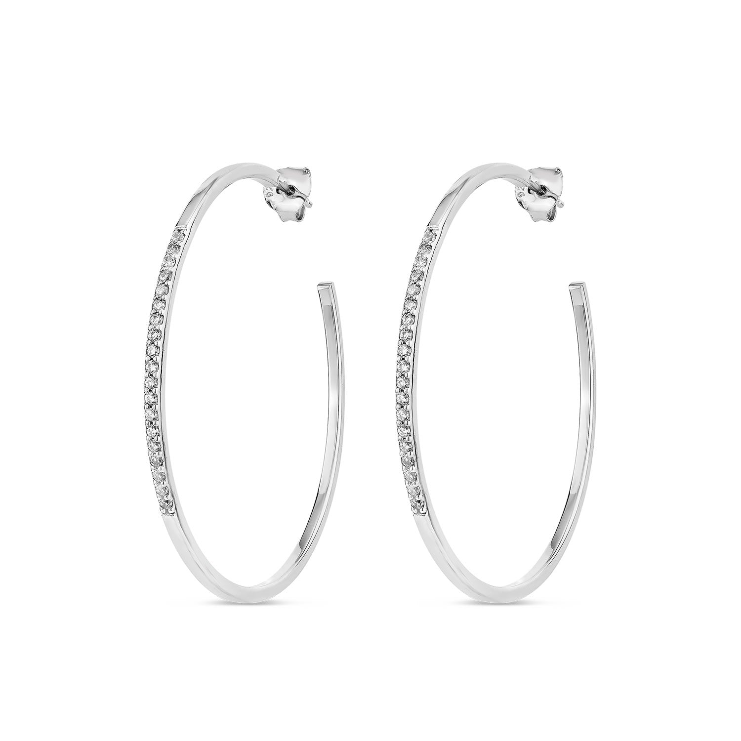 These hoop earrings are handcrafted from a 925 sterling silver base with a premium silver rhodium plate and feature man-made white diamonds. They are hypoallergenic.