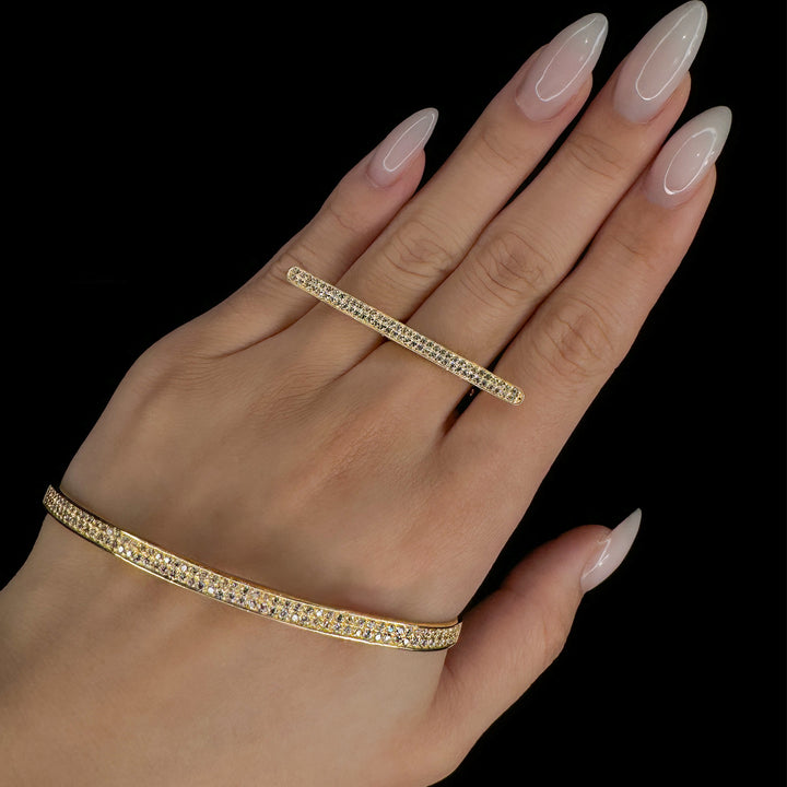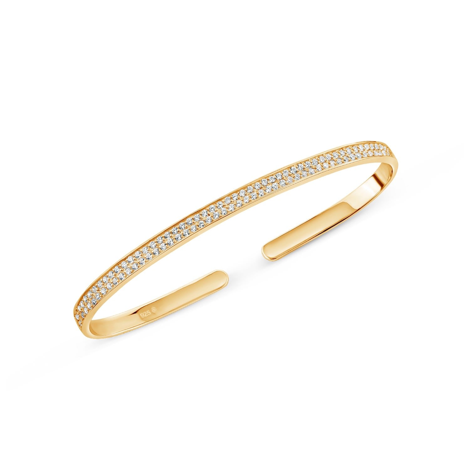 This palm cuff is handcrafted from a 925 sterling silver base with 18k gold vermeil and features man-made white diamonds. It is hypoallergenic.