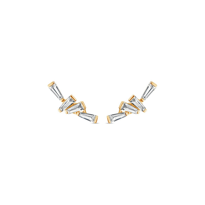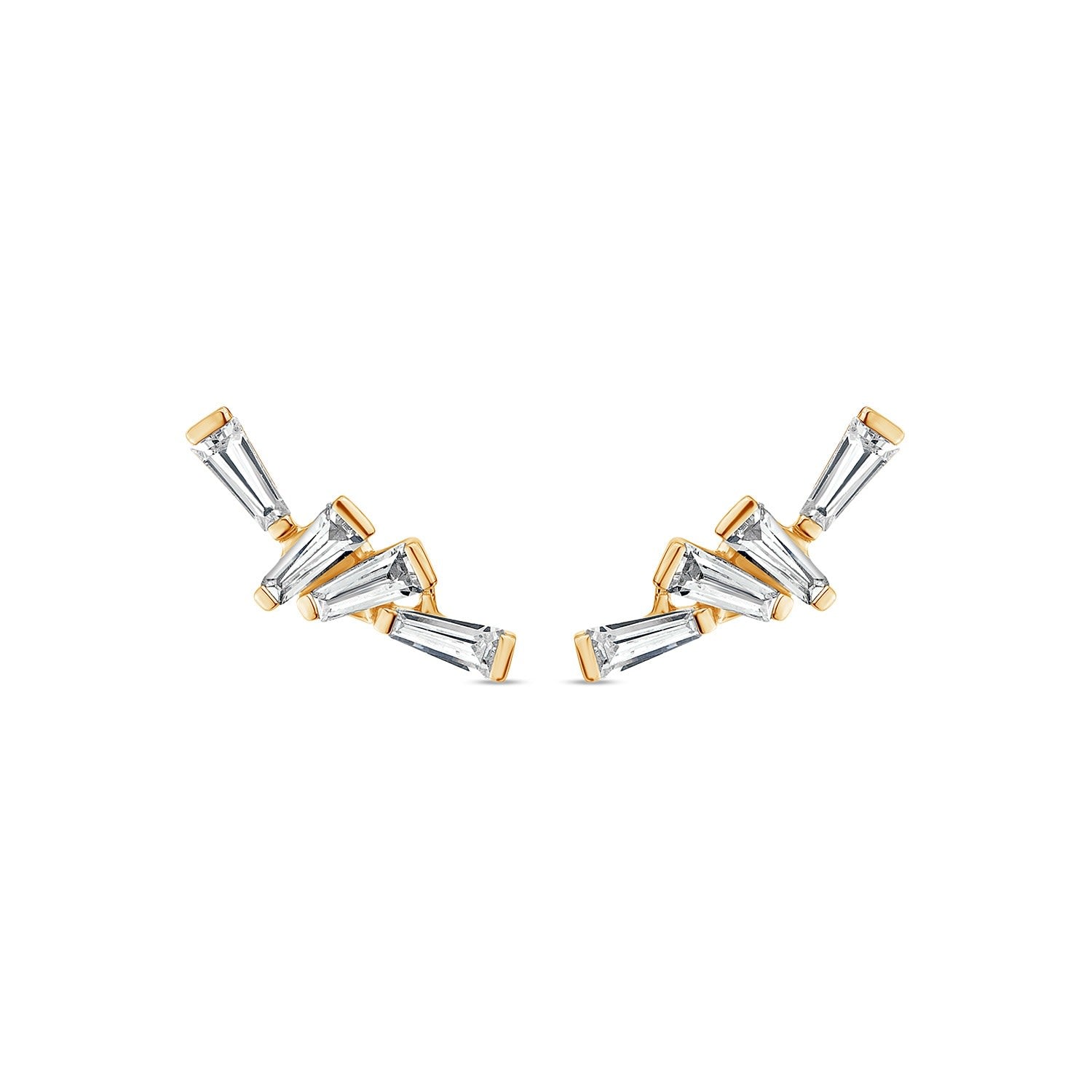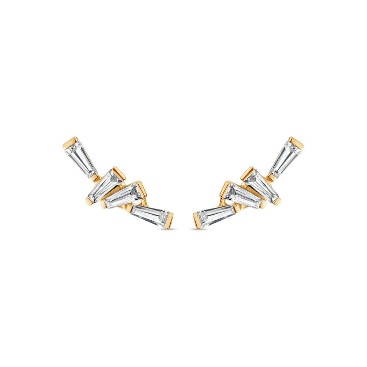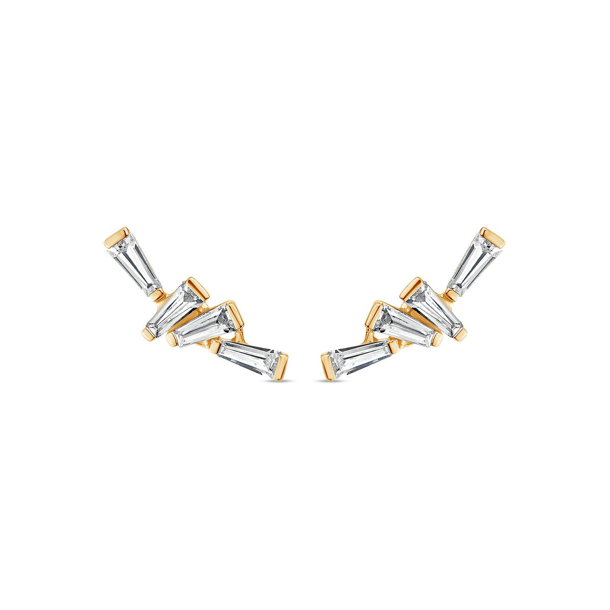 This ear climber is handcrafted from a 925 sterling silver base with 18k gold vermeil and features man-made tapered baguette white diamonds. It is hypoallergenic.