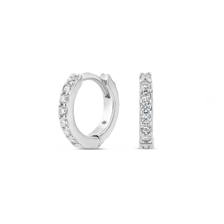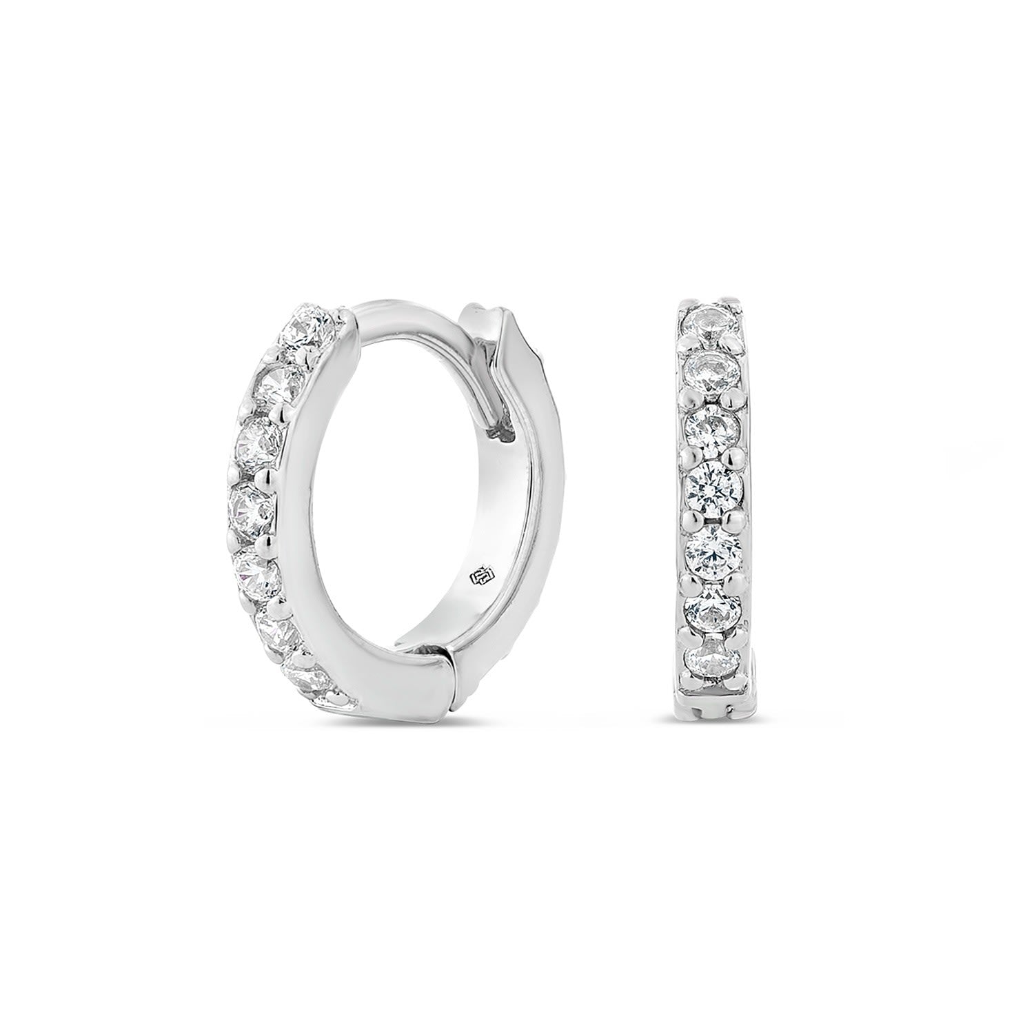 These huggie earrings are handcrafted from a 925 sterling silver base with a premium silver rhodium plate and feature man-made white diamonds. They are hypoallergenic.