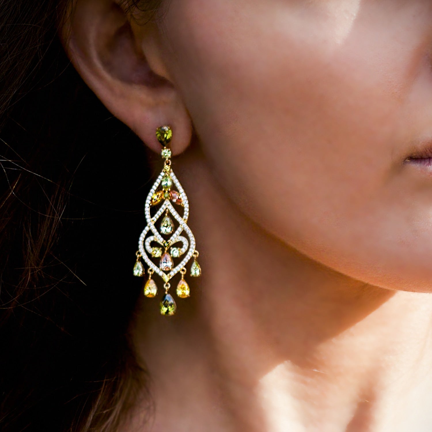 These Chandelier Earrings by Sally Skoufis are designed to captivate with their dramatic elegance. A luxurious cascade of man-made olive, champagne, and citrine diamond stimulants creates a vibrant and luminous presence. These earrings speak to a bold clientele, symbolizing a new frontier in conscious luxury and a vibrant reimagining of traditional craftsmanship. They are a statement piece perfect for adding a touch of bold glamour and purposeful design to any look.