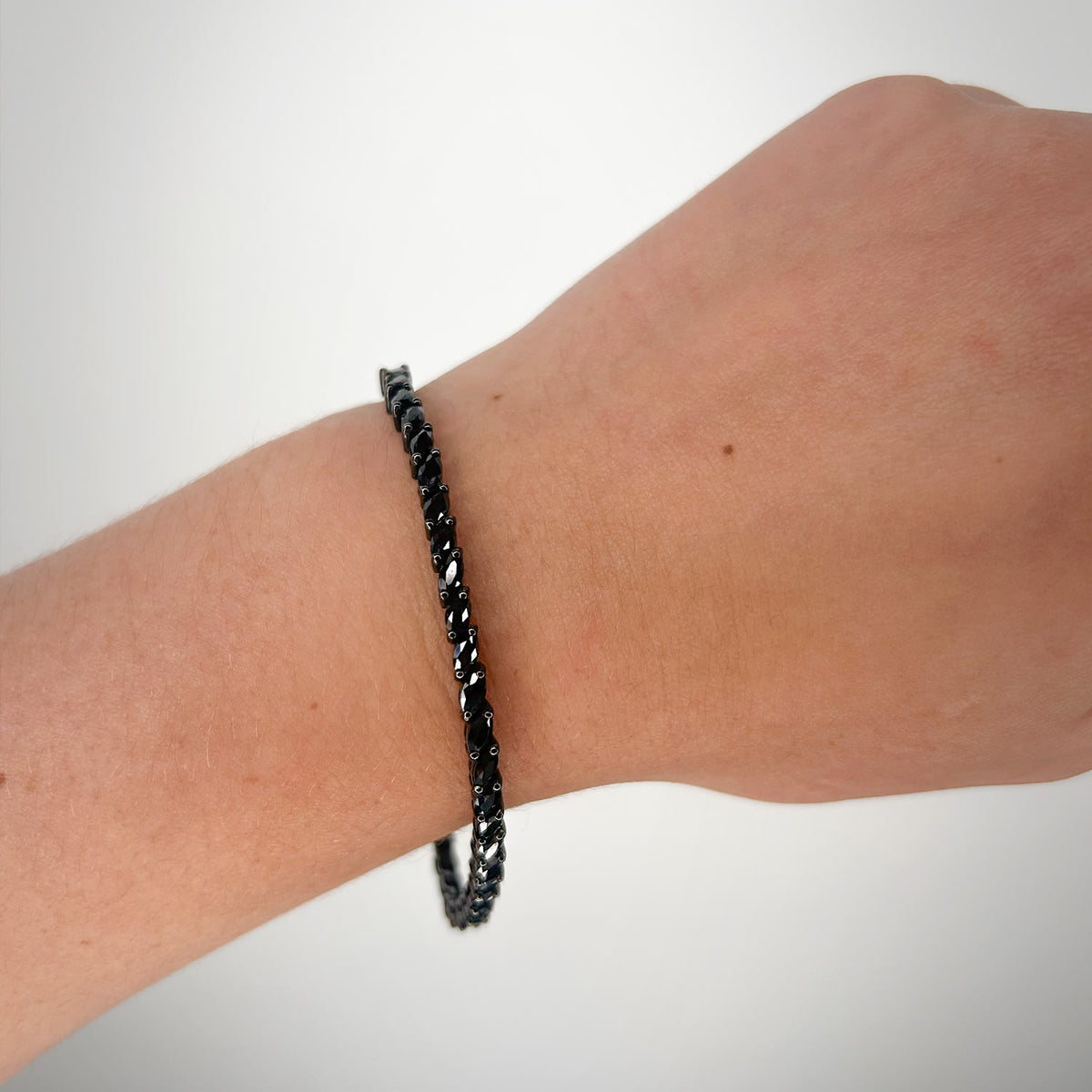 Handcrafted from a solid 925 sterling silver base, this hypoallergenic bracelet features meticulously hand-set man-made cubic zirconia black diamond stimulants and is finished with a durable premium black rhodium plating.