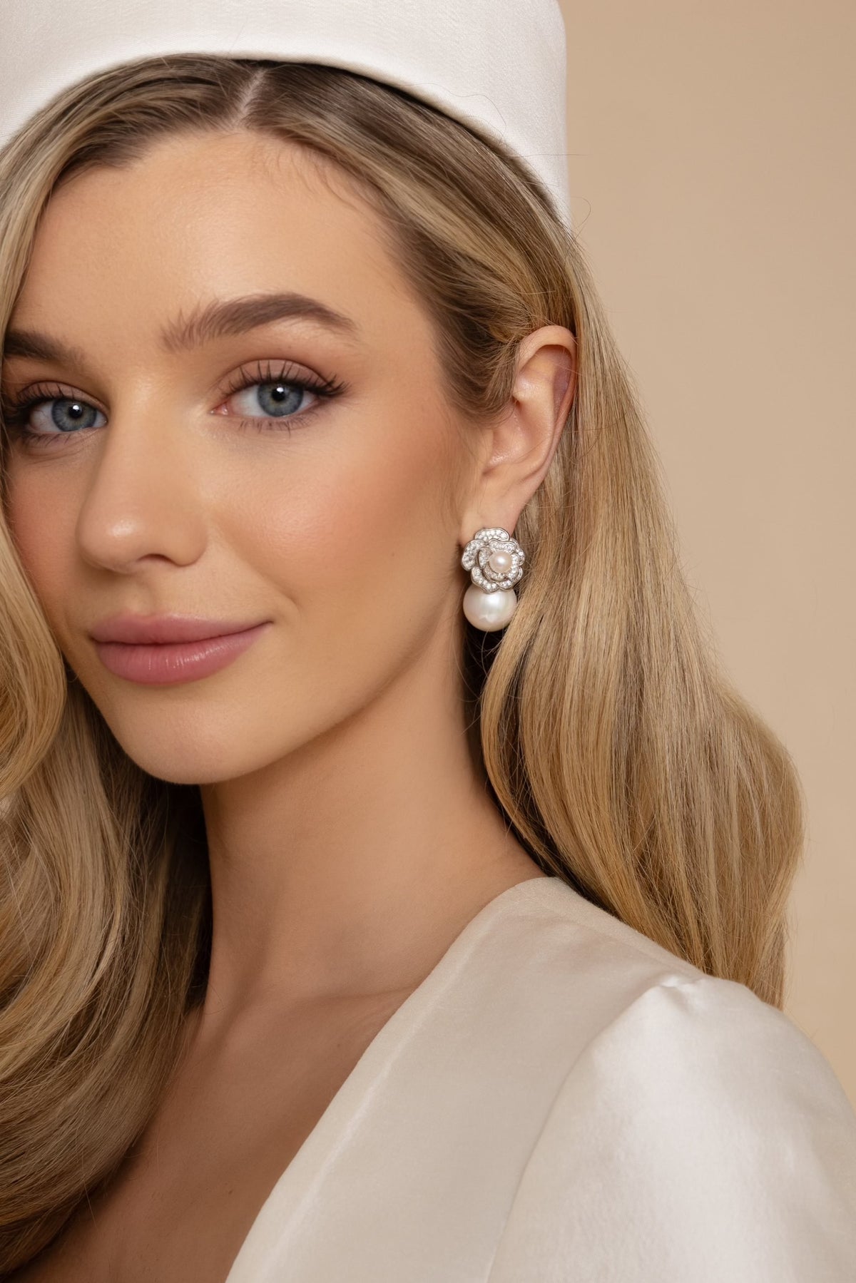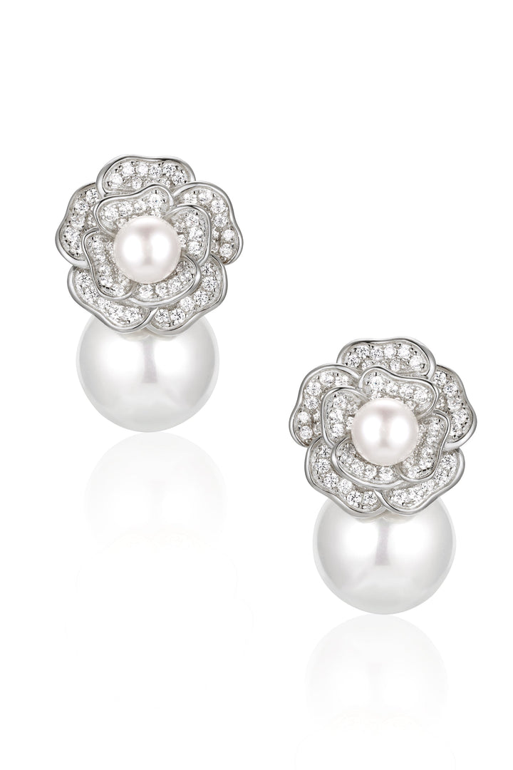 These drop pearl earrings are handcrafted from 925 Sterling Silver, plated in rhodium, and feature AAAAA-Grade cubic zirconia stones and a shell pearl.