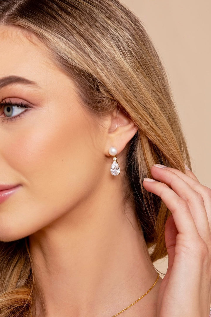These ‘Highgrove’ Freshwater Pearl & Crystal Drop Gold Earrings by Santinni are a delicate and demure accessory. Handcrafted by artisans from silver and plated in yellow-gold, these earrings feature expertly faceted zircon crystals and a lustrous freshwater pearl. They softly frame the face for a classic and feminine look.