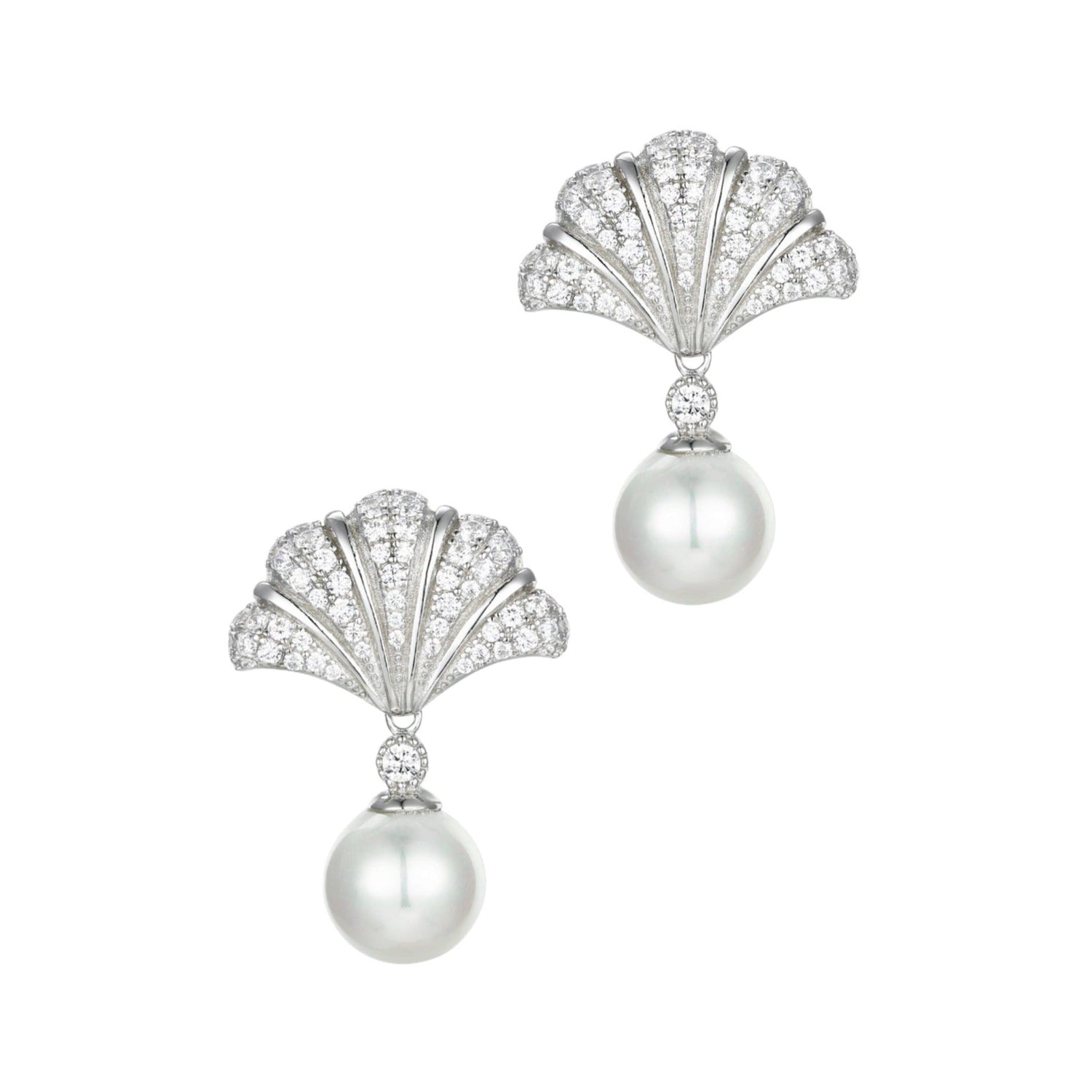 The Sovereign Silver Earrings With Pearl by Santinni are a regal and opulent statement. Handcrafted with a "feather fan" motif and expertly faceted zircon crystals, they exude luxury and sophistication. The lustrous shell pearl that falls gracefully beneath adds a touch of classic elegance, making these earrings a truly majestic accessory for a special occasion.