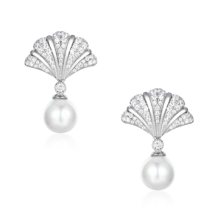 These Sovereign' Silver Earrings With Pearl by Santinni are a regal and opulent statement piece. Handcrafted by artisans, the design features a striking "feather fan" motif with expertly faceted cubic zirconia crystals. A graceful shell pearl dangles below, adding a lustrous finish to the stately design. These earrings are perfect for adding a touch of luxury and elegance to any special occasion.