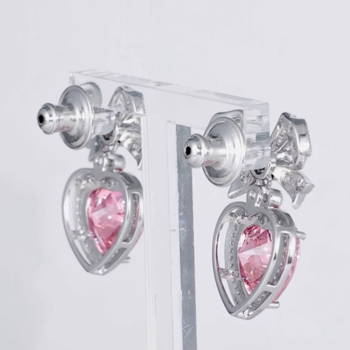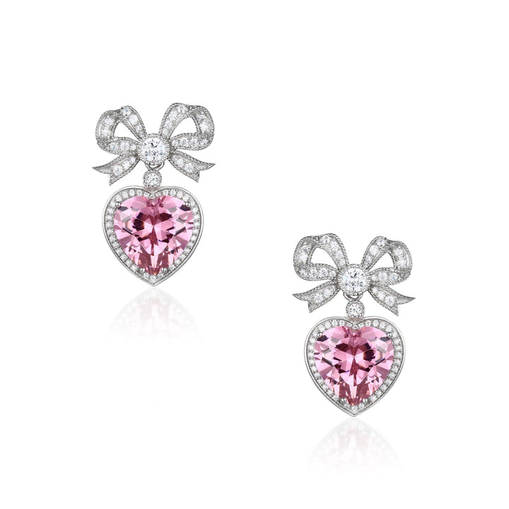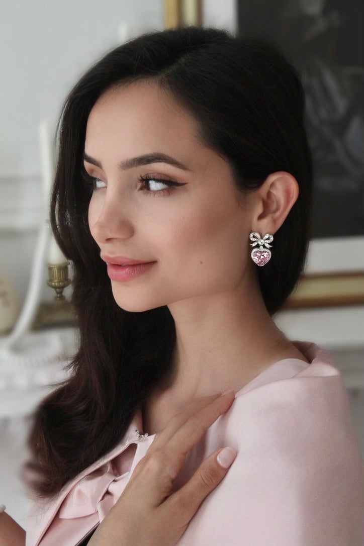 Princess Bow & Crystal Heart Silver Earrings