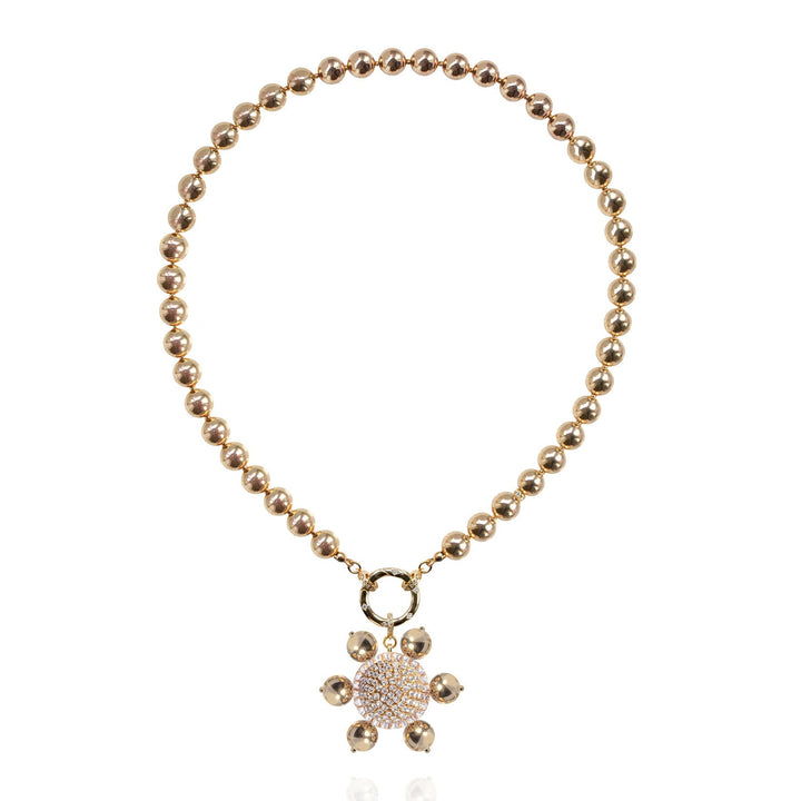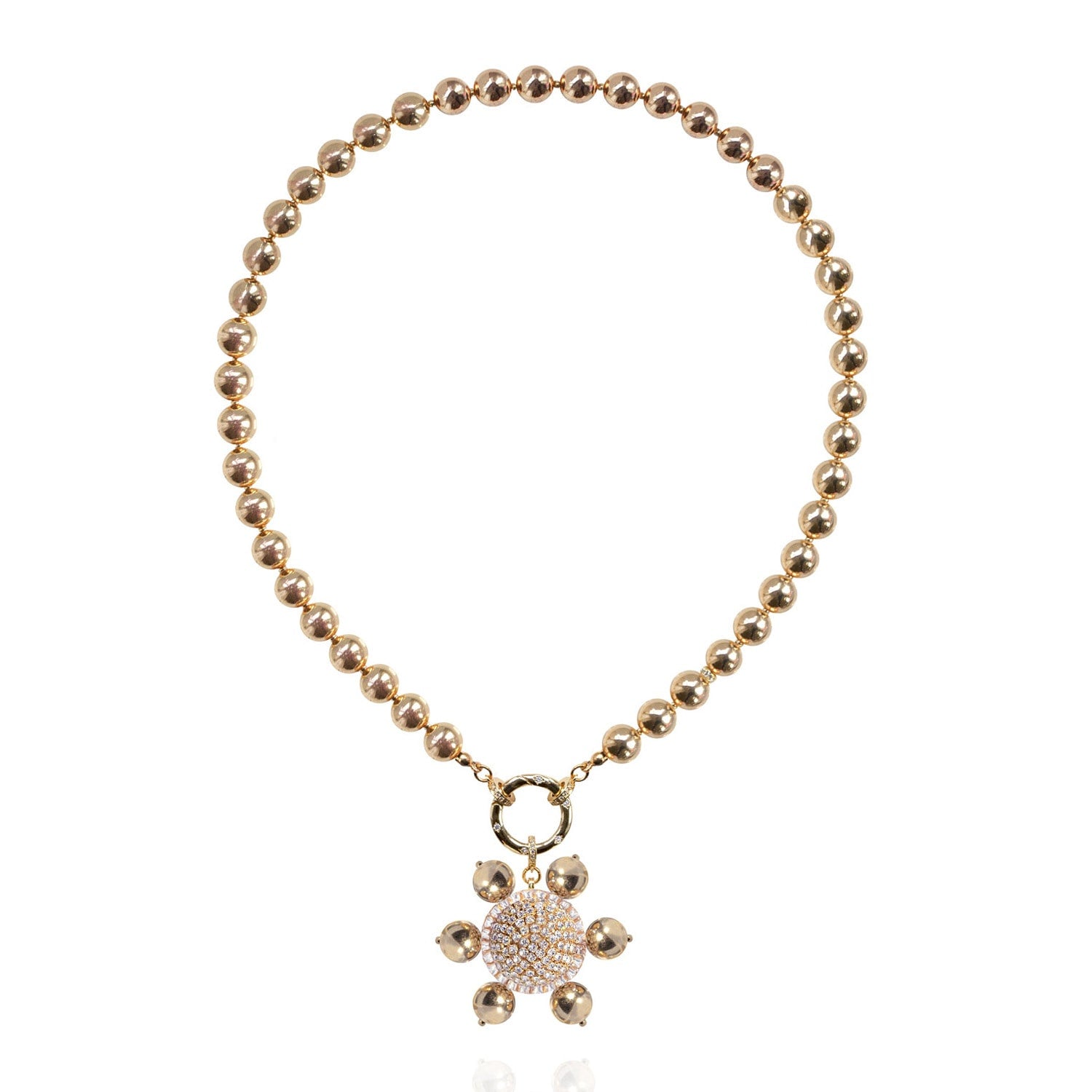 This Jolie Necklace by Saule Label is a lavish statement piece that exudes classic glamour. The heavy hematite strand feels like a piece of elegant armor, while the centerpiece starburst, with its glittering rhinestones and shining beads, adds a touch of pure luxury. This necklace is designed for those who want to channel their inner Audrey and make a bold and unforgettable impression.