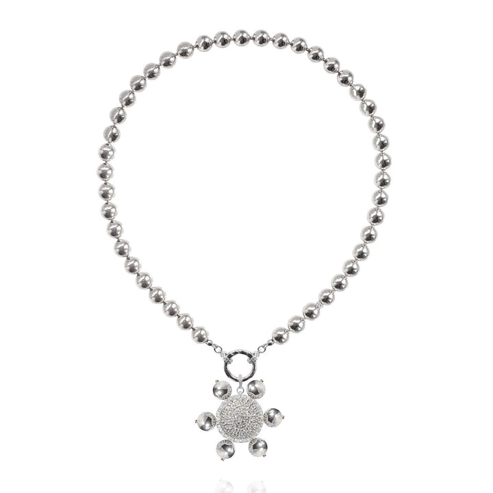 This Jolie Necklace by Saule Label is a lavish and glamorous piece that feels like "glamorous armor." Handmade in Detroit, it features a heavy hematite strand with a starburst centerpiece of glittering rhinestones and shining beads. This necklace channels a bold, classic Hollywood vibe, making it a statement-making accessory that is both loud and luxurious.