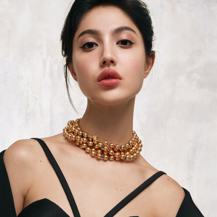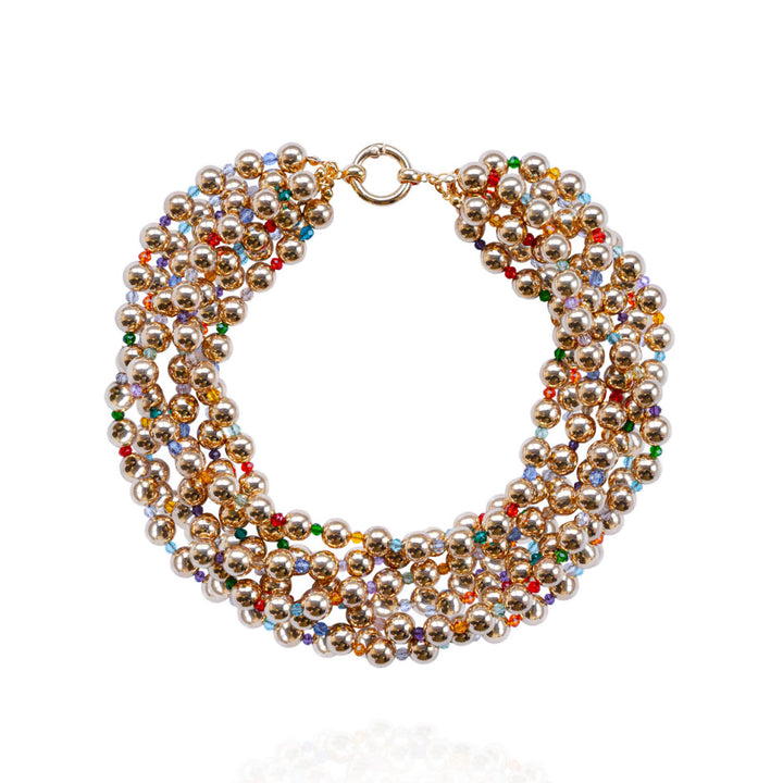 The Ilka Necklace Stack by Saule Label is a set of candy-colored strands that look "sweet enough to eat." These necklaces are made of heavy hematite beads in metallic gold, speckled with rainbow beads and crystals. The stack is handcrafted in Detroit with 18K Gold Plated Brass Hardware, offering a statement of color and vibrant personality.