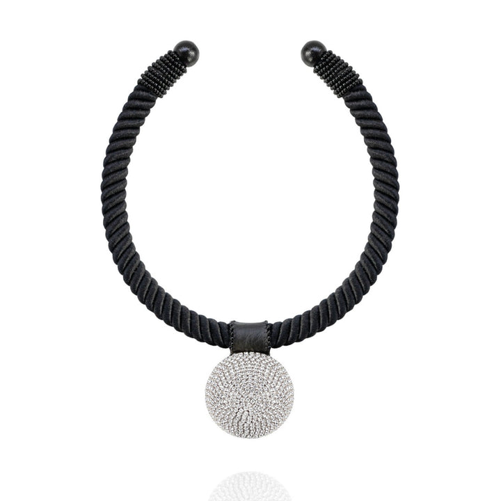 This Gaia Glam Necklace In Moonlite Shimmer by Saule Label is a stunning piece for lovers of sparkle. It features a spherical pendant covered in dazzling rhinestones, creating a striking contrast against a rope-wrapped choker cuff. Embodying the spirit of the Greek goddess Gaia, the mother of earth, this necklace adds a touch of opulence and vibrant energy to any outfit, celebrating the beauty and power of life.